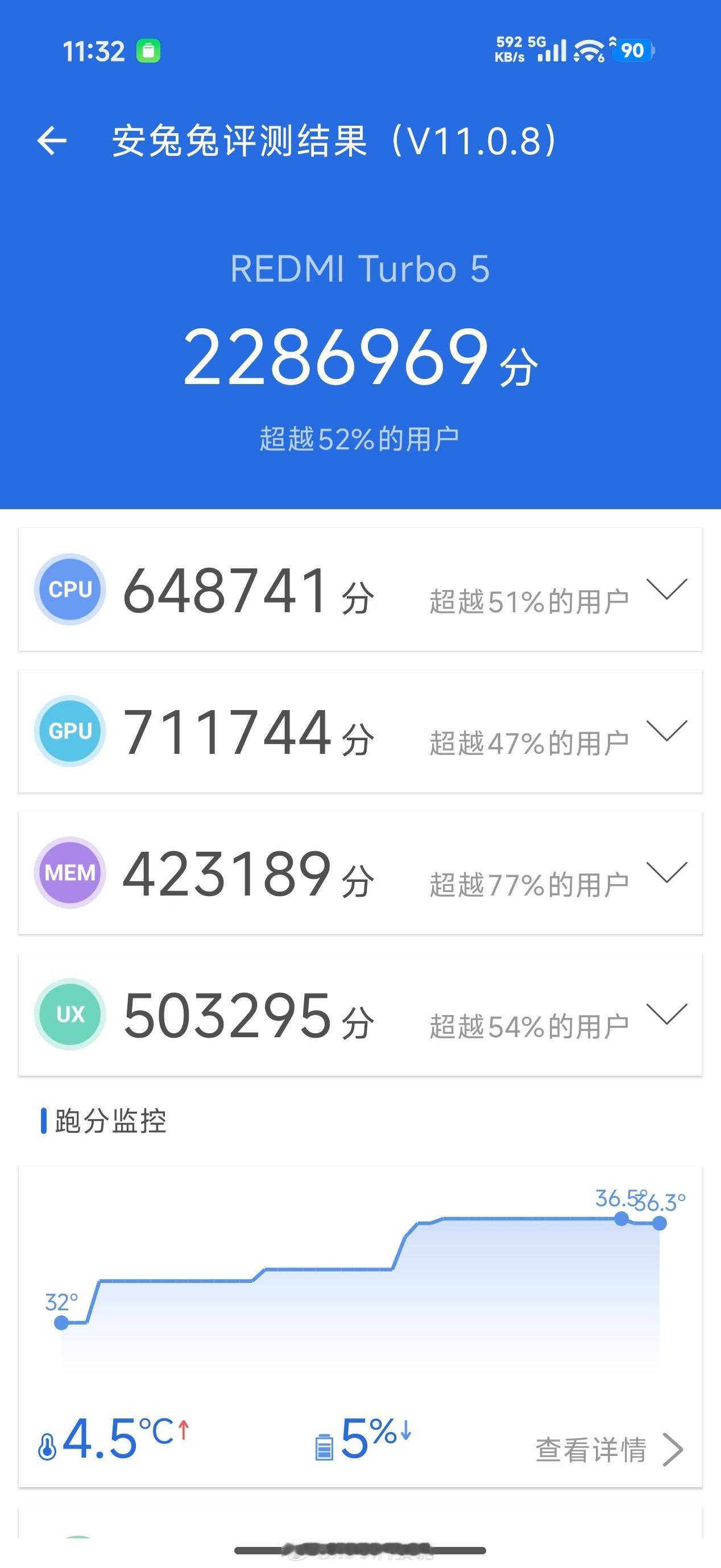 这一次REDMI Turbo5,相比上代,最大的一个改变,是屏幕缩小了,产品定位继续在变……turbo5首发测评 屏幕从6.67寸变成了6.59寸黄金中屏,加上同档罕见的金属中框,旗舰大R角设计,触感细腻的玻璃后盖,8.18mm厚和204克重量,机身更窄手感更好了。不过自带的手机壳,拉低了手感。屏幕素质和Turbo 5 Max一脉相承,M10发光基材,发光效率提升11.4%,3500nits峰值亮度,DC和3840Hz PWM混合调光,支持小米青山护眼。而且因为屏幕尺寸更小,460PPi反而更加大,显示更细腻。性能方面,搭载天玑8500Ultra处理器,8颗A725全大核设计:1颗3.4GHz+3颗3.2GH+4颗2.2GHz A725。台积电4nm工艺,CPU提升7%,GPU提升25%,功耗下降20%。Geekbench6 CPU单核跑分1730,多核跑分6800。加上5300mm²的双阶凸台冰封散热和新一代狂暴引擎,常温下安兔兔性能跑分229万,相比上一代提升25%以上,提升很明显。王者荣耀极致画质,先玩一个多小时,再测数据,一局下来平均119.5满帧运行,玩游戏没啥问题。拍照影像,扫码、还原。5000W像素索尼LYT600主摄,1/1.95英寸,F1.5大光圈,支持OIS光学防抖。拍照图片色彩风格有点淡,不是拉饱和度的,不过整体色彩还原还可以。充电和续航方面,7560mAh,比上一代增加了1010,本身6.59寸屏幕缩小耗电小,所以续航顶太多了。偏重度场景,两天一夜,总亮屏7个半小时,剩余电量15%。第一天亮屏4小时42分剩50%;两天共有4小时20分的重度使用,包括王者荣耀3小时18分钟,安兔兔性能跑分1小时,如果日常使用的话,续航更加夸张。待机功耗,晚上8小时耗电4%。充电速度和Max一样的100W超级快充,支持100WPPS,兼容性好真的好评。实测原装100W充电头,峰值速度85W,不过2分钟内下降,最终稳态在36W-39W,前面5分钟充电15%,后面每5分钟充电10%。小米的65W 氮化镓双口充电头,峰值速度58.5W,每5分钟充电量,和原装100W几乎一样,30分钟充电65%,59分钟 100%,后面几乎没涓流慢充。亮屏玩游戏的充电速度,从峰值43W,稳定到16W。Turbo5依然是求变的一代,屏幕变小手感提升,整体更加精致耐看;Max往上接替K系列至尊之后,Turbo要站稳2K档质感性能机,就看明天的价格了。