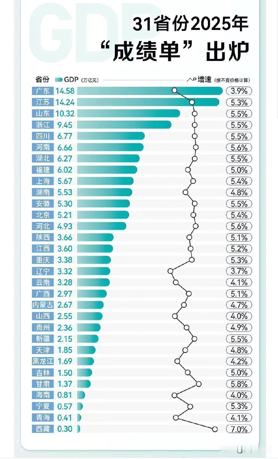 2025年31省份GDP出炉了,经济总量前十格局稳定,大省“压舱石”作用显著 头部省份经济规模庞大,格局稳固。 排名前十的省份依次为: 1,广东(14.58万亿元) 2,江苏(14.24万亿元) 3,山东(10.32万亿元) 4,浙江(9.45万亿元) 5,四川(6.77万亿元) 6,河南(6.66万亿元) 7,湖北(6.27万亿元) 8,福建(6.02万亿元) 9,上海(5.67万亿元) 10,湖南(5.53万亿元) 这十个经济大省贡献了全国超六成的生产总值,是稳住全国经济基本盘的“压舱石”。 有意思的是,江苏增速很快,但依旧排名第二;四川全年GDP依旧超过河南;湖南排进前十,没有掉队,超过安徽;安徽GDP超过北京的 ;我们贵州排名不变,依旧是第22名,GDP2.36万亿元。 (图片来源于网络) 2025年经济 2025gdp 中国GDP排行全国GDP 全国GDP区域 GDP排名 全国GDP排行