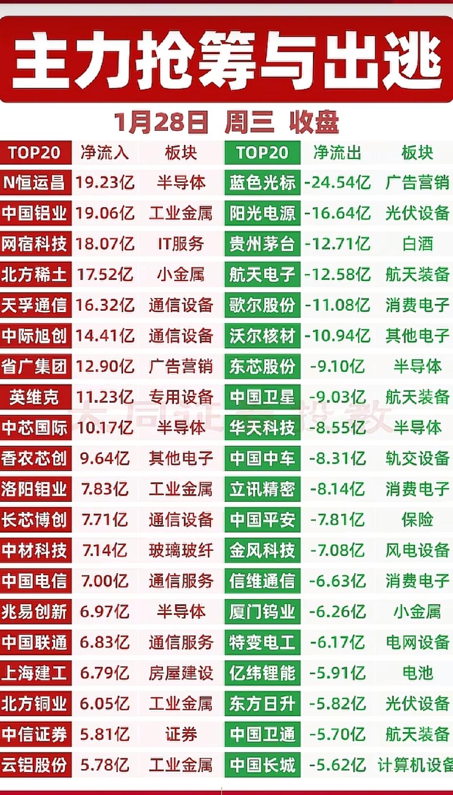 1月28日,周三A股主力资金抢筹出逃一览表!!! N恒运昌新上市股,今日主力大幅流入19.23亿,后市值得关注;中国铝业主力资金大幅流入19.06亿,后市值得高看一眼;蓝色光标主力资金大幅流出24.54亿,后市需小心谨慎!!!