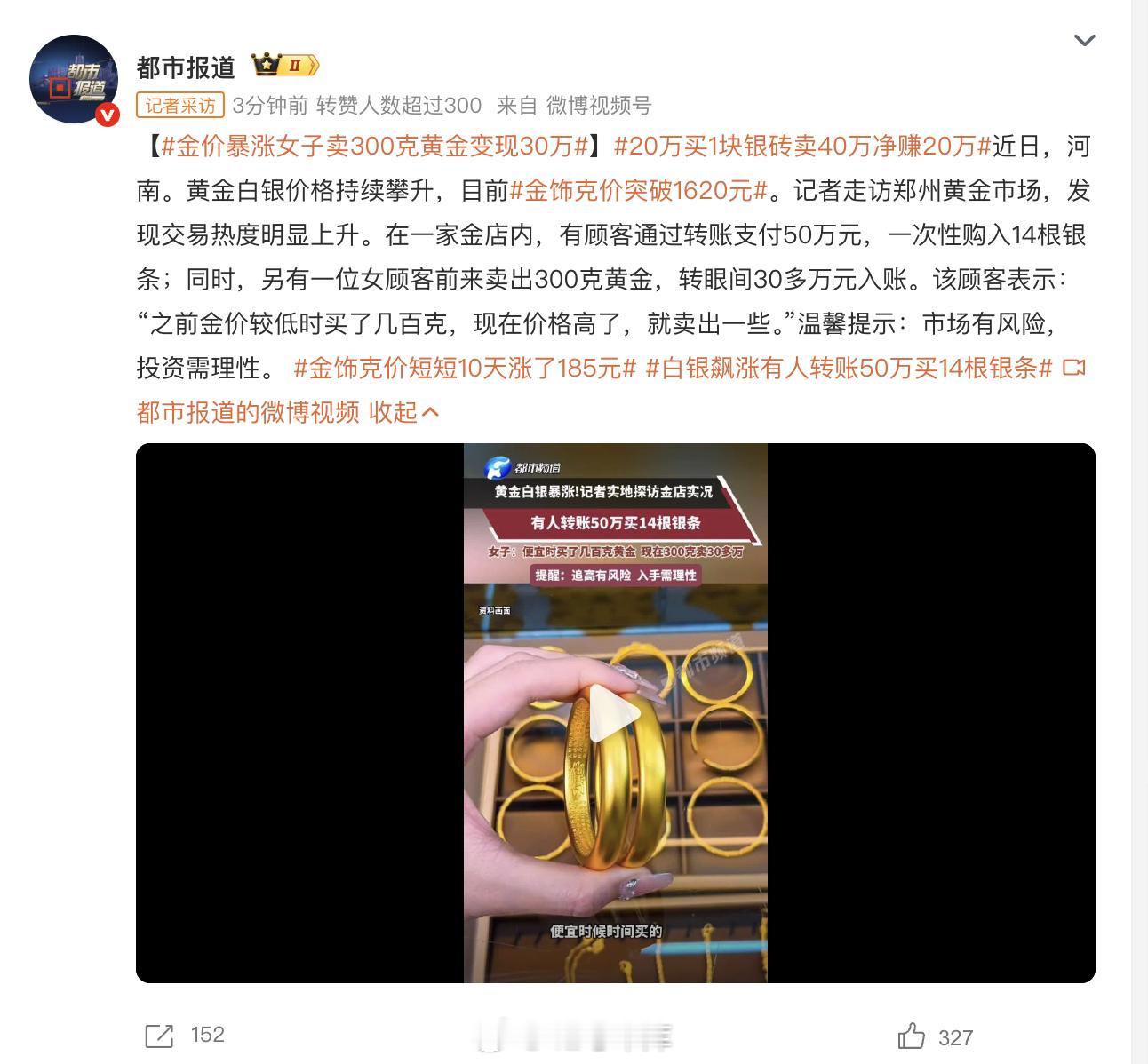 金饰克价突破1620元 现在是买金饰还是投资金比较好?大家准备卖出了吗?42how金价暴涨女子卖300克黄金变现30万