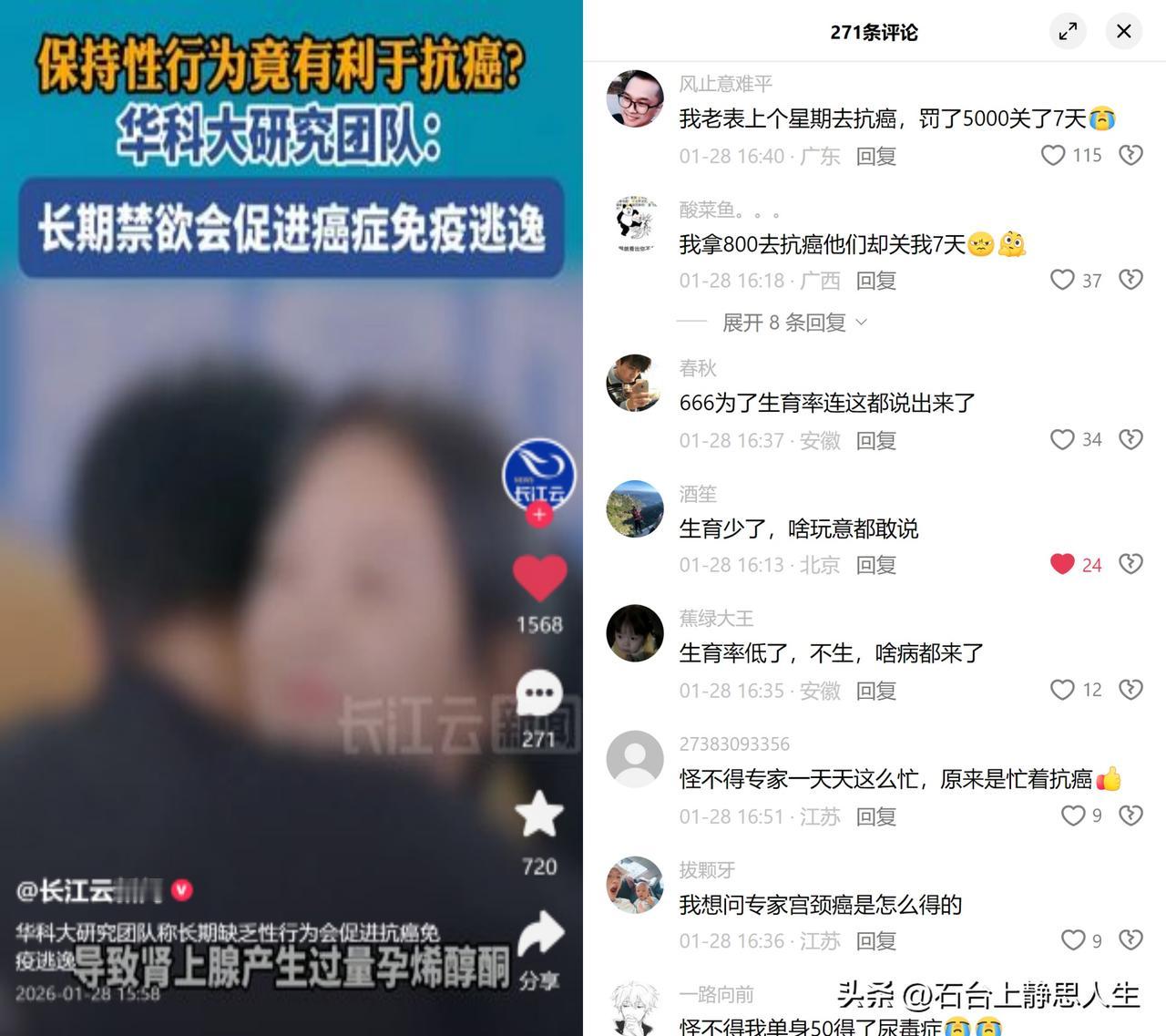 一篇抗癌研究,留言区全歪楼了。 华中科技大学团队发表论文,称长期缺乏性行为会影响抗癌免疫机制。结果大家没人聊研究本身,全是玩梗的,有人拿它当犯事被抓的挡箭牌,有人直接扣上催生育的帽子,还有人拿宫颈癌质疑结论。 这事儿看着滑稽,本质是科研和大众之间的信任裂痕。 现在不少人对专家研究有天然抵触,一沾生育、性这类敏感点,先给结论扣帽子,再忙着玩梗。殊不知严谨的医学结论被简化成大白话后,早就变了味。 就说宫颈癌的质疑,99%的宫颈癌由HPV感染引起,多性伴侣才是高危因素,禁欲反而能大幅降低风险,和研究的免疫机制逻辑根本不冲突。 什么时候我们能先耐下性子听专业声音?