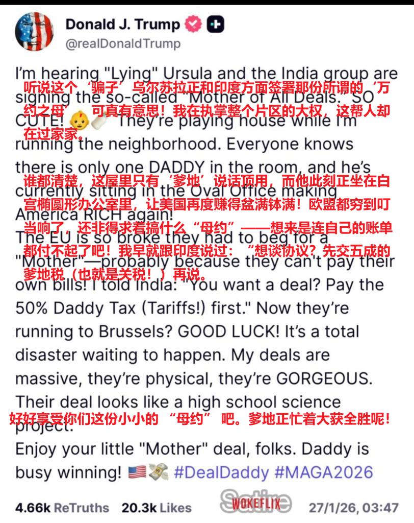 特朗普非常生气,非常生气,不仅生莫迪的气,而是生冯德莱恩的气。欧盟领导人首次以主宾身份出席了印度共和国日庆典,还与印度签署了“交易之母”,要特朗普这位“交易之父”下不了台,更何况冯氏是在美欧关系转型的关键时期访问的印度,完全不把美国当成盟友。 有人模仿特朗普的口气代他写了一篇回应帖子,把特朗普的心态刻画的惟妙惟肖。 “我听说这个‘骗子’乌尔苏拉正和印度方面签署那份所谓的‘万约之母’,可真有意思!我在执掌整个片区的大权,这帮人却在过家家。” 要知道特朗普这辈子最在意两样东西:一是“美国优先”的霸权面子,二是“交易之王”的专属名号。 冯德莱恩这次带着欧盟和印度搞出的大动作,相当于同时抽了这两样宝贝一耳光,他能不暴跳如雷才怪。 更让特朗普膈应的是,这场“过家家”式的合作,偏偏踩在了美欧关系最脆弱的节点上,还把印度这个美国想拉拢的“准盟友”拉到了欧盟阵营,算盘打得全天下都听见了。 这份让特朗普眼红到冒火的“万约之母”到底是啥?其实就是谈了近20年才落地的印度-欧盟自由贸易协定,双方都把它吹成“有史以来最大的贸易协定”,覆盖20亿人口,裹着全球四分之一的GDP体量,核心是互相免除超过90%商品的关税。 对欧盟来说,这是冯德莱恩对抗特朗普保护主义的“救命稻草”——自从特朗普重返白宫,就拿着关税大棒对着欧洲乱挥,即便美欧之前达成过贸易协定,欧盟输美商品还是要扛15%的关税,欧洲车企、制造业早就怨声载道。 而印度这边,也被特朗普的关税政策逼得够呛,去年8月美国把印度输美商品税率飙到50%,印度成了被加征关税最高的国家之一,急需找个大市场对冲风险。 冯德莱恩选在印度共和国日搞这套仪式,更是把政治意味拉满。印度共和国日的主宾之位,历来只给最亲密的战略伙伴,以前奥巴马、马克龙都坐过,去年印度邀请特朗普,结果被他干脆拒绝,今年冯德莱恩不仅带着欧洲理事会主席科斯塔高调出席,还特意穿了东方风格服装和莫迪同框,陪着看完全程阅兵——连印度特色的摩托车叠罗汉、动物方队都没落下,这份“示好”的姿态,明摆着是做给美国看的。 用特朗普的话说,这哪里是签协议,分明是在他眼皮子底下“结小圈子”。 特朗普的怒气里,藏着一层自己都不愿承认的恐慌:欧盟正在摆脱美国的控制。过去他总把“没有美国,欧洲人早就该说德语了”挂在嘴边,反复羞辱欧洲盟友,质疑北约承诺的可靠性,还全盘否定欧洲的能源、贸易政策,把跨大西洋伙伴关系搅得一团糟。 可他忘了,北约唯一一次启动集体防御条款,是在9·11后驰援美国,而美国在北约共同预算里也只出16%左右,所谓的“美国恩赐论”本就是自欺欺人。如今欧盟忍无可忍,开始主动找出路,印度这个即将成为全球第四大经济体的市场,就成了欧盟对冲美国风险的最佳选择。 更让特朗普窝火的是,莫迪政府一边拿着欧盟的好处——欧洲降低印度纺织品、珠宝的准入门槛,还答应引入清洁能源技术和资本,帮印度稳住数百万就业岗位;一边又把这份协定当成和美国讨价还价的筹码。 毕竟印度不想彻底得罪美国这个最大出口国,就想靠着和欧盟、中国的贸易协议,逼着美国在关税问题上妥协。 上海国际问题研究院的专家就点透了,印度就是想通过多找伙伴,撬动美国和自己达成让步,典型的“两边讨好,两头获利”。 冯德莱恩也有自己的小算盘,这份协定看似是经济合作,实则是欧盟的战略突围。俄乌冲突后,欧盟意识到过度依赖俄罗斯能源和美国安全保护的风险,急需构建多元化的供应链和伙伴关系。 印度既有地缘政治分量,又有庞大市场,刚好能满足欧盟的需求。而且欧盟还想把印度打造成替代中国的出口市场和投资目的地,在战略上制衡中国,可谓“一箭双雕”。 只不过这份协议也不是铁板一块,欧盟的碳边境税会冲击印度钢铁、铝产业,农产品准入、劳工标准等分歧也没彻底解决,能不能落地还不好说,英国《金融时报》干脆直言,这更像一份“政治宣言”而非实质协定。 特朗普的愤怒,本质上是对自己霸权失控的焦虑。他习惯了用交易逻辑操控盟友,用关税大棒逼迫各国妥协,可这次印欧“抱团取暖”,偏偏戳破了他的套路——你越是封闭施压,我们就越要另起炉灶。欧盟用行动证明,布鲁塞尔不是华盛顿的附庸,印度也用灵活走位表明,新兴国家不会任由美国摆布。 这场看似针对贸易的合作,实则是全球格局多极化的又一个信号,特朗普再怎么咆哮,也挡不住各国寻求战略自主的潮流。 或许在特朗普眼里,冯德莱恩和莫迪的合作就是“过家家”,但这出“过家家”背后,是各方对美国单边主义的集体反击。 当“交易之父”只懂用霸权施压,而不是平等合作,自然会被盟友和伙伴抛弃。接下来特朗普会不会用更狠的关税报复欧盟和印度?印欧协定又能不能跨过内部分歧真正落地?这场博弈才刚刚开始,而全球贸易秩序的重组,也正在这些博弈中慢慢成型。