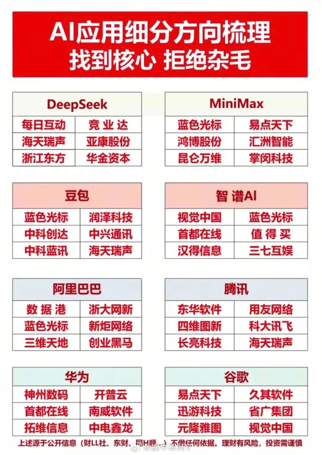 三大硬核赛道核心标的全梳理!半导体+AI应用+光通信精准卡位……半导体投资逻辑:国产替代是当前最核心的驱动力。预计未来3-5年,国内半导体设备材料的国产化率将从目前的20%-30%提升至50%以上。(龙头代表通富微电、北方华创、兆易创新)AI应用投资逻辑:AI大模型的技术迭代与商业化落地是主线。2026年将是AI应用的“落地大年”,To B端的AI服务、To C端的AI娱乐场景有望快速起量。(行业代表:易点天下、蓝色光标)CPO光通信投资逻辑:算力基建的“刚需”支撑。全球AI算力中心的爆发式建设,直接拉动了光模块、光芯片、光引擎等核心部件的需求。(行业龙头代表:中兴通讯、光迅科技等等)投资有风险,决策需理性。以上仅为行业风险梳理,不构成具体投资建议。
