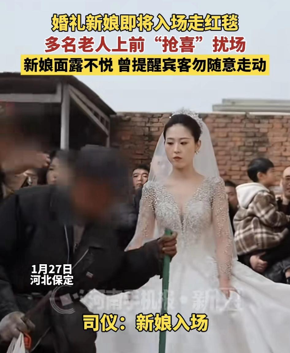 河北保定一场婚礼现场,新娘准备入场的时候,忽然一位老人拄着拐杖在新娘面前走过,旁边的人大喊,不要走过去知情人透露,婚礼仪式开始之前新年有特意的提醒他们但不知道为什么还会出现这样的事情,这种强势的情况在当地的风俗来说是对新娘子不好的,相信在村里大家都懂得这样的畏惧,新年单是颜色也不好看。