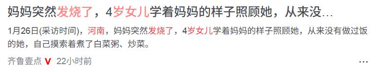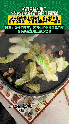万万没想到!近日河南,女子发烧在床上休息,到了晚上感觉身体好了一些便想起床给孩子做饭,没想到这时四岁的女儿却端着两个碗走了进来,里面是一碗粥和一盘菜,一问才知道,原来是孩子担心妈妈生病难受,自己学着妈妈做饭的样子给妈妈做了饭。 河南的一间卧室里,灯光昏暗,一阵奇怪的“咯吱、咯吱”声打破了夜晚的寂静。这声音听起来既不像老鼠啃噬,也不像机器故障,而是一位发烧卧床的母亲,正在用力咀嚼。 碗里盛着的,是泾渭分明的生米粒和几片半生不熟的青菜叶。旁边的盘子里,躺着几根被电饼铛匆忙炙烤过的白菜火腿。而站在床边等待“食客”评价的大厨,个头还没灶台高,今年刚刚四岁。 这一幕发生得太突然。此前,这位母亲被高烧如重石般死死压在床上,动弹不得。那肆虐的高烧仿佛狰狞的恶魔,将她牢牢禁锢,她就这样卧榻不起,整整捱过了一日。随着入夜后体温稍降,她挣扎着想坐起来,脑子里全是孩子还没吃饭的焦虑。 可还没等她的脚沾地,卧室门就被推开了。那个平日里还要撒娇求抱的小小身影,竟端着两个碗走了进来,步子迈得像走钢丝一样小心翼翼。 这顿饭,显然是厨房里的一场“灾难”。米粥是夹生的,米心还是硬的,青菜大概只是在热水里洗了个澡。于母亲而言,此味远胜世间珍馐。在她心中,那独特的滋味,仿若跨越了一切奢华,即便与满汉全席相较,亦是不遑多让。 更有意思的是孩子接下来的动作。她没有放下碗就走,而是伸出了手背注意,是用手背而不是手心轻轻贴在母亲的额头上,嘴里还像模像样地念叨着:“不烫了,不烫了。” 紧接着,她用那双小手扶着母亲坐直,把枕头垫好。这不仅仅是一次烹饪尝试,这简直是行为心理学的一次现场演示。 四岁的孩子哪里懂得什么叫护理?她所做的一切,不过是平日里母亲照顾她时的像素级复刻。那些量体温的手势、那些哄人的碎碎念,早就刻进了她的“镜像神经元”里。 当大人倒下的瞬间,孩子体内那个“小父母”的本能程序,被瞬间激活了。根本不需要谁来教她电饼铛怎么插电,也不用教她米里要加水,因为在你看不到的时候,她一直是一台全天候开机的摄像机。 这碗夹生粥的照片传到网上后,评论区瞬间炸开了一道裂痕。有人感动得直掉眼泪,喊着这是“报恩天使”。但另一波声音却显得格外刺耳且真实。 不少家长看着屏幕里的四岁大厨,再看看自家正满地打滚的“神兽”,陷入了深深的自我怀疑。一位网友的留言获得了高赞:“别说做饭了,我家娃六岁了,连开水壶都不让碰,剪刀更是违禁品,进厨房都要被我不耐烦地撵出去。” 这确实是个巨大的讽刺。我们在河南看到了四岁孩子的生存奇迹,却在更多家庭里看到了六岁甚至更大龄儿童的“功能退化”。 我们习惯了给孩子包裹上厚厚的安全气囊,怕烫、怕切手、怕摔碗,这种过度的保护欲,正在切断他们反哺能力的生长根系。 河南这位母亲是因为生病“被迫放手”,却意外验证了一个教育真理:所谓的懂事,从来不是教出来的,而是“用”出来的。你不给他那把铲子,他永远不知道锅里的菜是热的。 让我们把目光收回到那碗粥上。从物理层面看,它确实欠缺火候,米是冷的,芯是硬的,吃下去甚至有点硌牙。但从情感层面看,这顿饭其实已经“熟透了”。 这是一次最朴素的能量守恒——母亲经年累月输出的爱,被孩子完整地接收,并以最笨拙、最原始却最滚烫的方式,回流到了母亲的胃里和心里。那咯吱作响的咀嚼声,大概是这个冬天最动听的协奏曲。