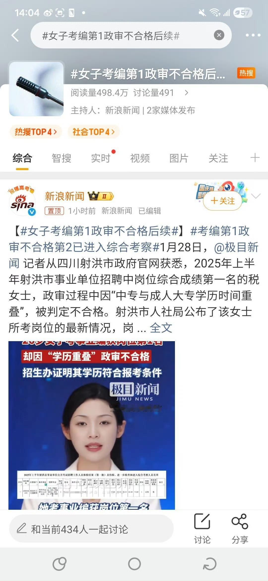 考编第1政审不合格后续:第1政审不合格后续:岗位已递补,考生学历争议仍待解 四川射洪“考编第一因学历重叠政审不合格”事件有新进展!1月28日官方信息确认,该医疗岗位已由总成绩66.8分的第二名邓某递补,且体检合格进入综合考察阶段,而原第一名税女士仍因“中专与成人大专学历时间重叠”被判定考察不合格。 事件始于2025年上半年招考,税女士以73.69分夺冠,却因2015年同时就读中专与成人大专,被指违反成人高考“在校生不得报考”规定。但射洪教育考试院曾出具证明,称其当年符合报考条件,双方依据冲突引发热议。 虽经人社局一个多月复核,最终未改变不合格结论,但律师指出,学历认定应由教育部门主导,考生无弄虚作假情形下,历史政策差异责任不应由个人承担。目前税女士是否申请行政复议尚未可知,网友热议“合规性”与“合理性”如何平衡。 考编政审严字当头,但规则适用需兼顾公平。你觉得学历重叠该否成为淘汰理由?