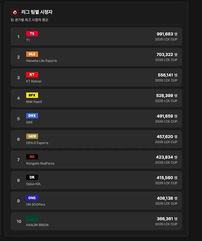 LCK Cup收视率公布,T1毫无悬念断层第一!但仔细一看榜单逻辑,简直让其他强队流泪...为什么联赛霸主GEN只能排第六?因为他们在分组里遇不到T1。为什么DK没进前五?因为还没对战到T1。在LCK,收视率的高低不一定看你打得有多好,主要看你离Faker有多近2026LCK 英雄联盟 T1