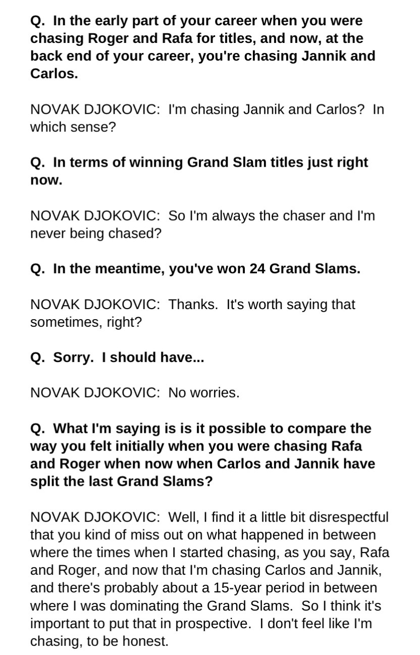 今天德约科维奇的赛后发布会上,有记者想让小德对比当年他追击纳达尔和费德勒的时候,