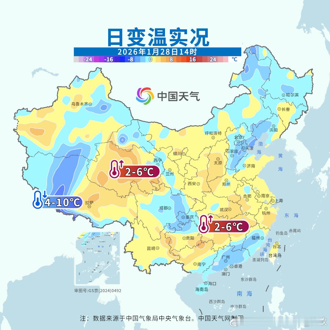 【气温波动】今天白天气温变化,主要还是和光照变化有关。甘肃肃北、西藏聂拉木、新疆木垒因为有云遮盖,光照减少,排在15时全国降温榜前3。而贵州盘州、云南广南、富宁因为准静止锋东撤,光照增多,气温明显上升,成为下午15时全国升温前3。