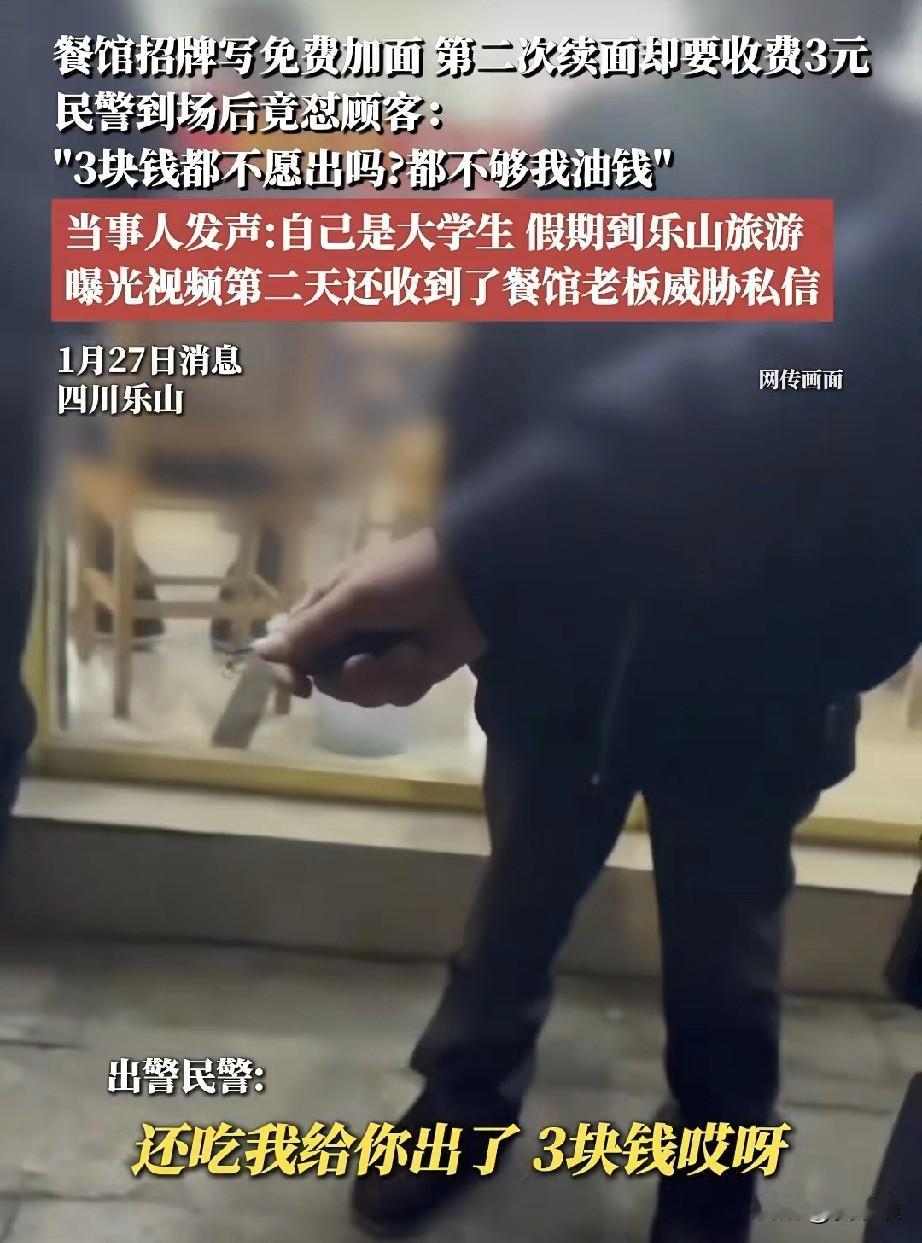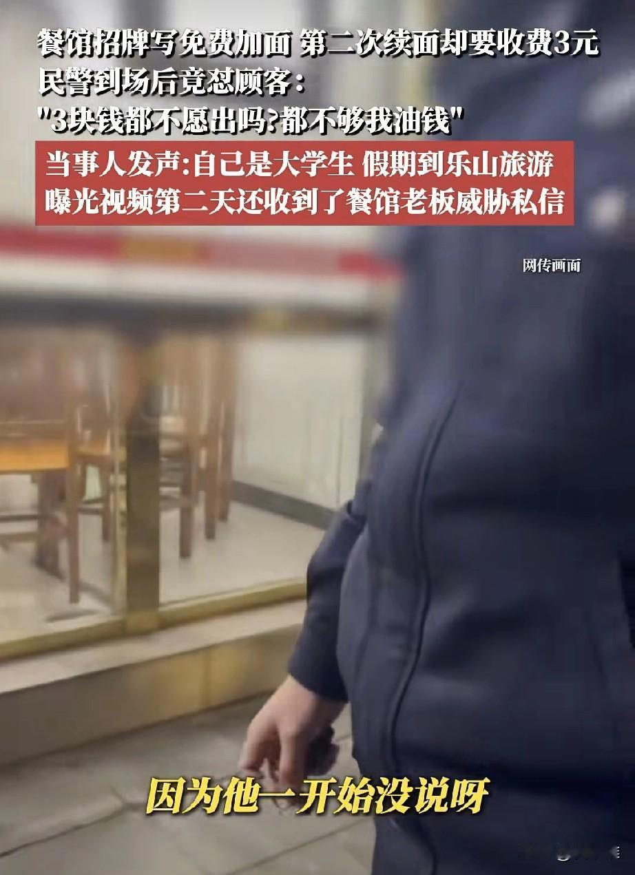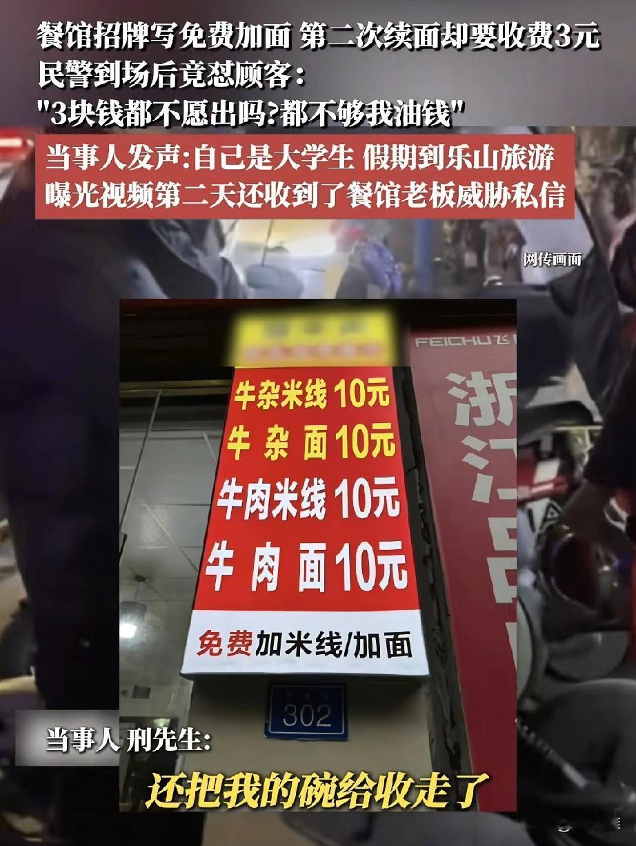 大学生小邢去乐山游玩,中午在景区的一家面馆吃饭,看到面馆招牌写“免费加面”,就加了一碗。当他想再加第二次时,老板却要收3元。小邢认为招牌没写限次数,觉得被欺骗,两人争执后老板报警,民警到场后没详细了解,反而对小邢说:“3块钱都不愿出?”周围人也指责他贪便宜。事后小邢上网吐槽,还被本地人攻击,这件小事引发热议:很多人觉得,要么老板就别搞“免费”噱头,要么就大大方方让加。而对游客来说,较真的不是为3块钱,而是想讨个明白和公平。