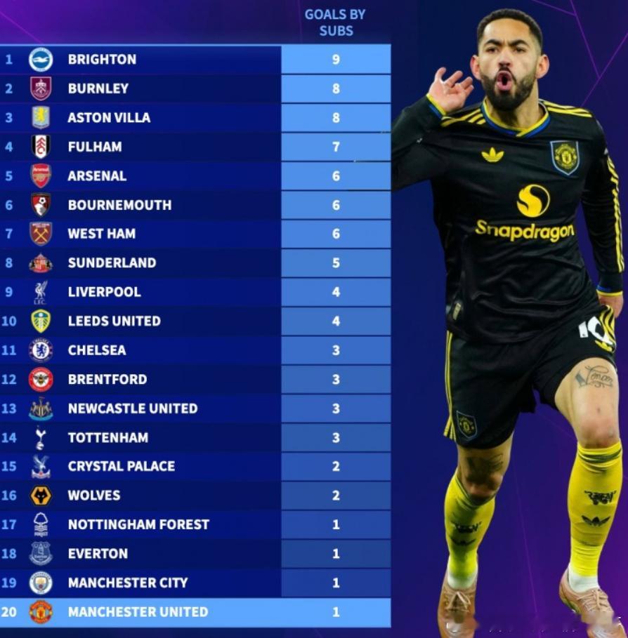 德国转会市场统计了本赛季各队替补球员在英超比赛中的进球数量,并列出榜单,布莱顿9球居首,曼城、曼联1球垫底,曼联替补球员唯一的进球就是库尼亚对阵阿森纳的制胜球。本赛季英超替补球员进球数量排名:布莱顿——9球伯恩利——8球阿斯顿维拉——8球富勒姆——7球阿森纳——6球伯恩茅斯——6球西汉姆——6球桑德兰——5球利物浦——4球利兹联——4球切尔西——3球布伦特福德——3球纽卡斯尔联——3球热刺——3球水晶宫——2球狼队——2球诺丁汉森林——1球埃弗顿——1球曼城——1球曼联——1球