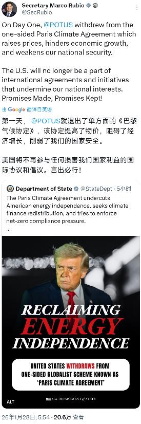 美国国务卿鲁比奥今天(北京时间1月28日)发文写道:“(上任)第一天,特朗普总统就退出了那份单方面的《巴黎气候协定》。该协定会提高物价、阻碍经济增长,并削弱我们的国家安全。美国将不再参与那些损害我们国家利益的国际协议和倡议。言出必行!” 要知道《巴黎协定》作为全球气候治理的核心框架,是继《京都议定书》后第二份具有法律约束力的气候协议,核心目标就是引导各国协同减排,将全球气温升幅控制在合理范围,凝聚了全人类应对气候危机的共识。 但在特朗普政府眼中,这份协定更像是束缚美国经济的枷锁,尤其会触动共和党背后传统制造业、化石燃料行业的利益。 当时特朗普政府就公开宣称,遵守《巴黎协定》会让美国承受3万亿美元的损失,丢掉650万个工业岗位,其中制造业岗位就占310万个,造纸、钢铁、煤炭等行业都会面临大幅产能收缩。 鲁比奥此次重申的“阻碍经济增长”,本质上就是延续了这一论调,将行业利益和短期经济指标置于全球气候安全之上。 不过这种说法从一开始就饱受争议,美国国内不少声音都对此提出质疑。 奥巴马政府时期的统计数据显示,美国可再生能源领域创造的就业岗位,早已是煤矿开采业的三倍之多,太阳能、风力发电等产业的投资前景远比传统煤炭行业光明。 就连埃克森美孚、英石油、壳牌等能源巨头,当年也纷纷发声支持《巴黎协定》,认为在保障能源供应的同时应对气候挑战完全可行,美国退出协定反而会失去在全球环境谈判中的话语权。 鲁比奥口中“削弱国家安全”的说法,更像是为退出协定找的附加借口,背后实则是对国际责任的逃避。 美国作为历史上最大的温室气体排放国,当前排放量仍占全球15%以上,稳居全球第二大排放国位置,本应在气候治理中承担更多责任。 《巴黎协定》要求发达国家为发展中国家提供气候资金支持,美国曾承诺向联合国绿色气候基金出资30亿美元,奥巴马政府离任前仅兑现10亿美元,特朗普上台后便直接搁置,退出协定更是彻底甩掉了这笔责任。 这种逃避行为不仅引发国际社会谴责,联合国秘书长古特雷斯当年就表示,美国此举严重削弱了全球减排努力,欧盟多国也联合声明不会因美国退出而放弃气候行动。 鲁比奥此刻重提此事,也和美国当前的政治语境与战略倾向密切相关。 近期他主导发布的美国国务院《2026-2030财年机构战略计划》,就处处透着“美国优先”的逻辑,即便在对华政策上强调“可控竞争”,核心还是围绕美国自身利益布局。 此次为退出《巴黎协定》背书,也是在强化这种战略导向,向外界传递美国不会为国际共识牺牲自身短期利益的信号。 但现实是,气候变化从不是单一国家的问题,没有任何国家能置身事外。 2025年初美国加州南部爆发的特大山火,过火面积超5.5万英亩,造成的经济损失高达2500至2750亿美元,气候专家明确指出,人类活动引发的气候变化加剧了高温天气,让山火等极端灾害更易发生。 鲁比奥和特朗普政府眼中的“利益”,不过是牺牲长远安全换取短期收益,最终受损的还是美国自身。 更值得注意的是,全球能源转型已是不可逆转的大势,《巴黎协定》的推进不会因美国退出而停滞。 美国退出协定后,欧盟、中国等纷纷加快新能源布局,在光伏、风电、电动汽车等领域抢占技术先机,反而让美国传统能源行业陷入被动。 穆迪分析公司首席经济师马克·赞迪就曾指出,拖延应对气候变化只会带来负面经济影响,积极行动反而能为经济发展注入动力。 鲁比奥的发文看似强硬,实则暴露了美国部分政客在全球议题上的短视。 将一份凝聚全球共识的气候协定定义为“损害国家利益”,本质上是把单边利益凌驾于全人类共同利益之上,这种做法不仅会让美国失去国际社会的信任,也会让自身在全球能源转型浪潮中错失机遇。 国际社会早已看清,美国这种反复“退群”的操作,只会动摇多边体系的根基,而气候变化带来的挑战,终究需要各国携手应对,绝非靠逃避就能解决。 鲁比奥口中的“言出必行”,更像是一种对国际责任的刻意漠视,最终只会让美国在全球气候治理中逐渐边缘化,付出更为沉重的代价。