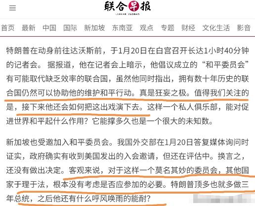 联合早报这一次一点面子也没有给特朗普!联合早报刊文痛批特朗普是自不量力!在特朗普对新加坡发出“和平委员会”的邀请通知之后,新加坡一直没有表态参加,现在反倒是联合早报站出来了。1月28日,联合早报刊文声称,特朗普成立的竟然是个私人俱乐部式的所谓“国际组织”,由特朗普担任主席,拥有唯一的否决权和委任权。 再瞧瞧这个委员会的章程,那更是让人觉得荒谬。整个章程里对加沙问题只字不提,却把目光放得老远,仿佛要管尽天下事儿,甚至还大言不惭地和联合国相提并论。 联合早报毫不客气地指出,真不知道特朗普是哪来的底气。要知道,联合国可是全球各国共同努力构建起来的重要国际组织,在维护世界和平、促进各国合作等方面发挥着不可替代的作用。它有着严格的规章制度和广泛的代表性,是各国共同参与、共同决策的舞台。 而特朗普搞的这个“和平委员会”,完全就是他个人意志的体现。他想凭借自己的影响力,打造一个与联合国平行的机构。可这哪里是那么容易的事儿?联合早报认为,美国这么做,无疑会进一步破坏联合国的权威和工作机制。 联合国好不容易建立起来的秩序和规则,岂能被一个私人俱乐部式的组织轻易破坏?这就好比在一个精心搭建的积木城堡里,突然闯进来一个调皮的孩子,想要按照自己的想法重新搭建,结果只能是把城堡弄得乱七八糟。 而且,联合早报还提到,特朗普妄图偷天换日,可他的如意算盘在盟友那里却碰了壁。特朗普或许以为,凭借美国的影响力和自己的个人魅力,能够轻松拉拢盟友加入这个所谓的“和平委员会”。但他显然高估了自己。在当今的国际形势下,各国都有自己的利益考量和外交策略,不会轻易被美国牵着鼻子走。 就拿欧洲一些国家来说,他们虽然与美国有着一定的盟友关系,但在很多问题上也有着自己的独立见解。他们深知,联合国在国际事务中扮演着至关重要的角色,不会轻易支持一个可能破坏联合国权威的组织。特朗普的这种做法,无疑是在把盟友往火坑里推,盟友们自然不会买他的账。 再看看亚洲的一些国家,他们也明白,国际事务需要各国共同协商解决,而不是由某一个国家或者某一个小团体说了算。特朗普的“和平委员会”,看似是为了维护和平,实际上却充满了个人私利和政治算计。这样的组织,很难得到亚洲国家的认可和支持。 从更宏观的角度来看,特朗普搞出这么个事儿,也反映出他在国际事务处理上的短视和自负。他似乎没有意识到,当今世界是一个多极化的世界,各国之间相互依存、相互影响。任何一个国家想要在国际事务中独断专行,都是行不通的。联合国的存在,正是为了协调各国之间的关系,促进各国之间的合作与发展。 而特朗普却试图打破这种平衡,建立一个以自己为中心的新秩序。这种做法不仅违背了国际社会的潮流,也损害了美国的国际形象。美国一直以来都自诩为世界的领导者,但它的领导应该是建立在公平、公正、合作的基础上的,而不是通过强制和霸权来实现的。 联合早报的这篇文章,无疑是对特朗普这种错误行为的有力批判。它让更多的人看清了特朗普的真实面目,也让国际社会更加坚定了维护联合国权威和国际秩序的决心。在未来的国际事务中,各国应该共同努力,推动多边主义的发展,加强国际合作,共同应对各种全球性挑战。 而对于特朗普来说,他也应该好好反思自己的行为。他应该明白,在国际舞台上,只有尊重其他国家的利益和意见,遵循国际规则和秩序,才能赢得其他国家的尊重和信任。否则,他只能成为国际社会的笑柄,被历史所淘汰。 总之,联合早报痛批特朗普自不量力这一事件,不仅仅是对特朗普个人的批评,更是对国际秩序和规则的一次捍卫。它提醒着我们,在当今复杂多变的国际形势下,我们要保持清醒的头脑,坚定地维护国际公平正义,推动世界朝着更加和平、稳定、繁荣的方向发展。