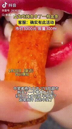 近日,一女子吃辣条吃出金条的新闻冲上了热搜。根据媒体的报道,12月27日,四川绵阳一名大学生去超市买了一卫龙辣条大礼包,女生可太爱吃这玩意了,回去以后,在半夜肚子饿了,就赶紧拆开来吃。 不料,吃到一半,发现里面有一根像金属类的小玩意,很细小,拿起来定睛一看,闪闪发光。 “这不会真的是金条吧?”女生开着玩笑,跟舍友说,一开始她是不信的,不过里面吃出了异物,她就打电话给客服咨询,结果呢人家说了,这确实是金条。 辣条里面吃出来的金条,这绝对是头一回见呀,女生再三确认后,客服给出的答案是,这金条是官方搞的活动,现在已经送出了300份,每一份都是定制金条,价值在3000元左右。 这也太幸运了,买30块钱的辣条,还能赚3000元的奖品,很多网友听了以后,都是跃跃欲试,纷纷下单买辣条,因此有的网友怀疑,这不会是辣条的销量上不去了,又骗我们买辣条了。 不管怎么说,这活动确实是真实的,只不过是有少部分的人比较幸运,但是没注意的朋友,中了奖也不一定兑奖,随手可能就扔了。 毕竟这样的事见多了,还真没几个人愿意相信呢。
