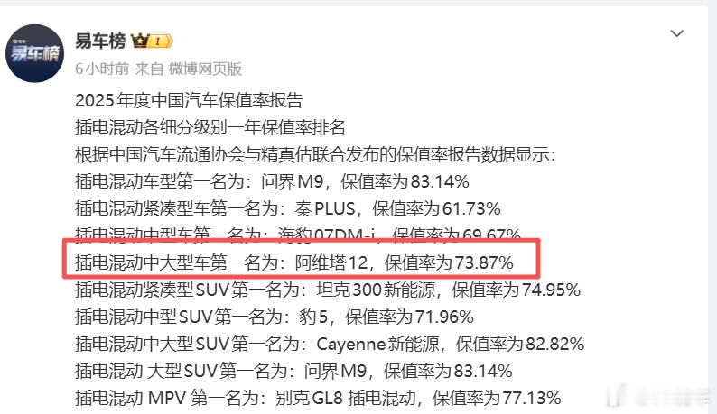 汽车 汽车超话 汽车销量榜超话 汽车知识新能源汽车汽场全开汽车保值率2025 插电混动中大型车第一名为:阿维塔12 ,保值率为73.87%。我从一开就极力推荐各位买增程12,看吧这保值率。