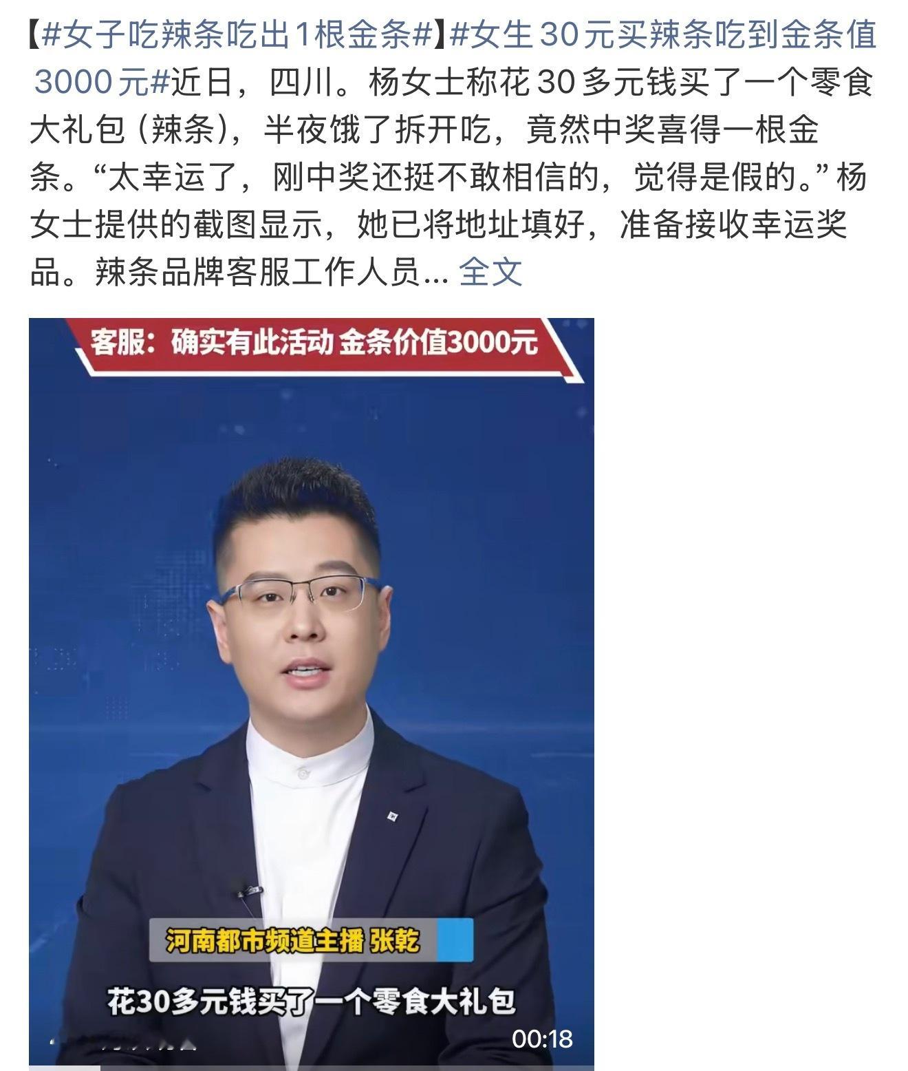女子吃辣条吃出1根金条有的时候想中奖未必能中,都是在不经意间