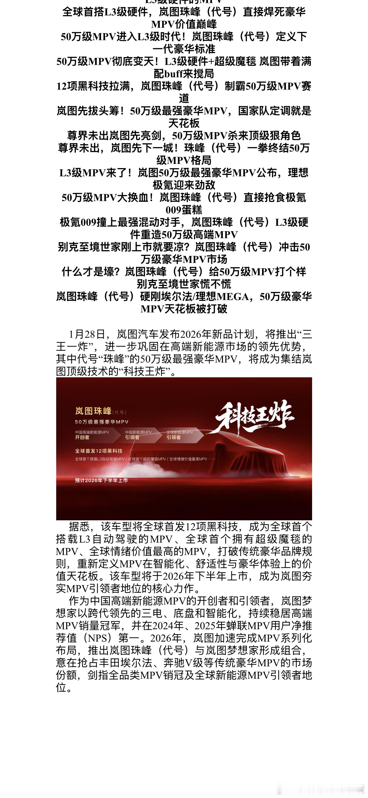 看到这篇新闻稿的标题我震惊了,岚图汽车岚图汽车 太TM卷了岚图 开年集体摊牌,2026念重磅新车要发出“三王一炸”,着销量目标保守估计得涨50%,客观估计就得翻倍啊北京·悠唐购物中心