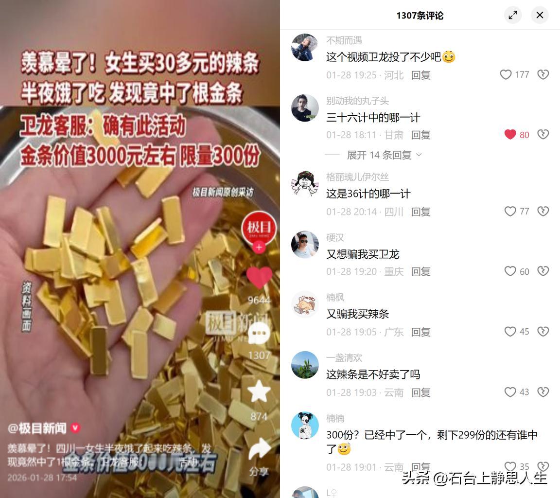女生吃辣条中3000元金条 四川绵阳的杨女士花30多块买了辣条,半夜解馋时发现中了根价值约3000元的金条。活动限量300份,她已经成功兑换,品牌客服确认活动属实。 这事一出,留言全是又想骗我买辣条的吐槽,大家心里都门儿清。商家这招算得太精,300根金条总投入也就90万,比起动辄几百万的硬广,这波自带热度的传播,简直是血赚。 本质上就是用小概率大奖拿捏普通人的侥幸心理:花几十块,就能拥有中大奖的期待,这种低成本的赌徒快感,恰恰是最能勾动消费者的。毕竟谁都想当那个幸运儿,哪怕知道概率微乎其微。 你有没有为类似的幸运诱饵掏过腰包?