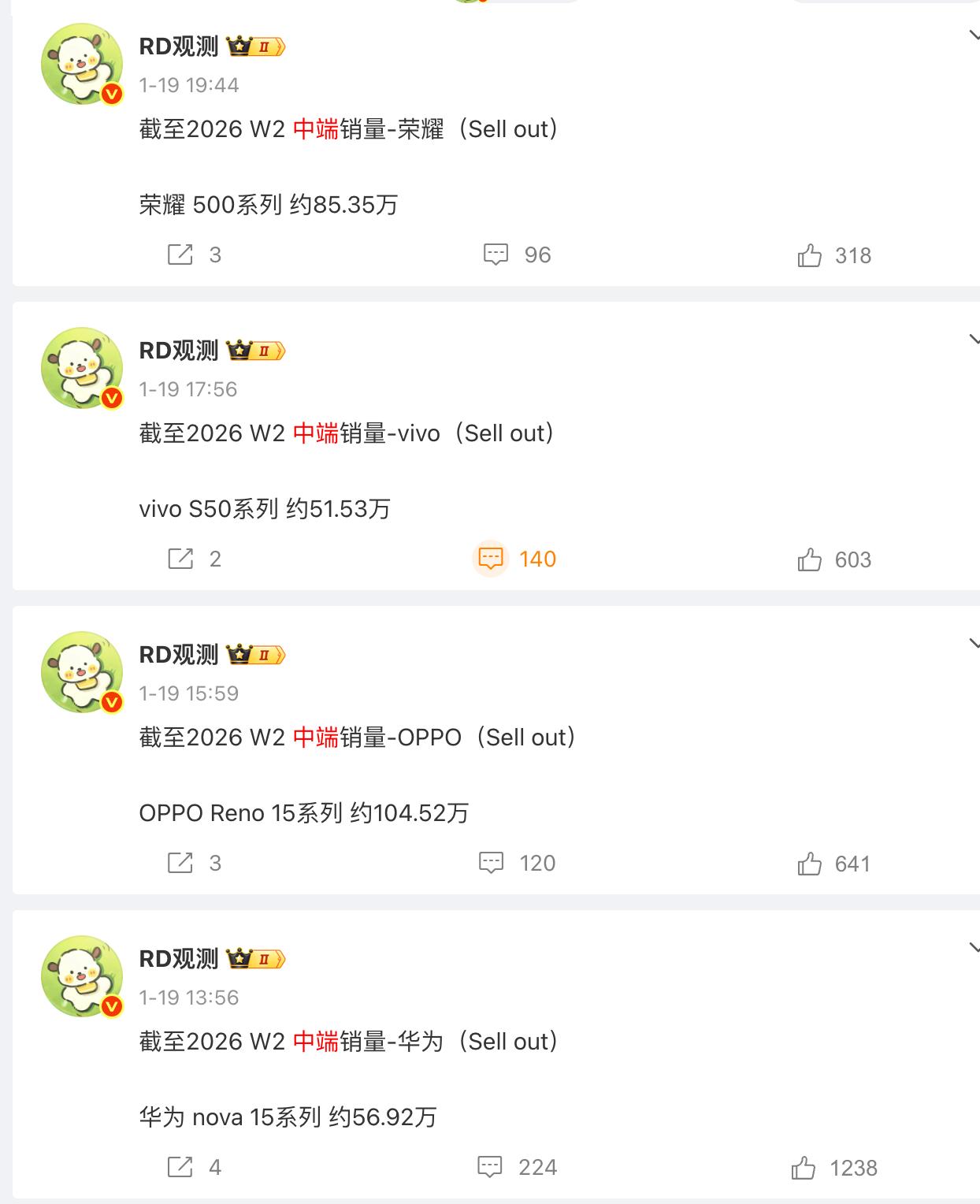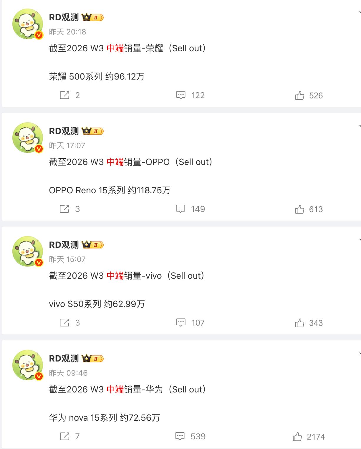 看了一下,HHOV几款走线下的中端机销量都挺不错的,每周都有10万+销量入账 截至2026 W3 中端销量 荣耀 500系列 约96.12万——单周增加10.77万 vivo S50系列 约62.99万——单周增加11.46万 OPPO Reno 15系列 约118.75万——单周增加14.23万 华为 nova 15系列 约72.56万——单周增加15.64万 截至2026 W2 中端销量 荣耀 500系列 约85.35万——单周增加10.81万 vivo S50系列 约51.53万——单周增加11.22万 OPPO Reno 15系列 约104.52万——单周增加12.89万 华为 nova 15系列 约56.92万——单周增加15.57万 截至2026 W1 中端销量 荣耀 500系列 约74.54万 vivo S50系列 约40.31万 OPPO Reno 15系列 约91.63万 华为 nova 15系列 约41.35万 我们可以看出,华为Nova15系列单周增加最多,均在15万以上,但是Nova15系列一共有三款机型,同样,OPPO Reno 15系列也是三款手机,甚至最近一周也增加了14万。而荣耀500系列和vivoS50系列均只有两款机型,数量上吃点亏,但是依然增长挺猛的。 OPPO Reno15和15Pro是2025年11月21日开售,Reno 15c推迟了一个月。 荣耀500系列是2025年11月24日发布,28日开售 vivo S50系列是2025年12月15日发布,19日开售 华为Nova15系列是2025年12月22日发布,25日开售 从时间上来看,OPPO Reno15系列最早,也是目前累计销量最高的。而华为Nova15系列虽然迟了一个月,目前来看增长最猛。但是几家的差距并不大,毕竟各自品牌都有固定群体。 大家觉得,这几款线下机谁最值得买呢?