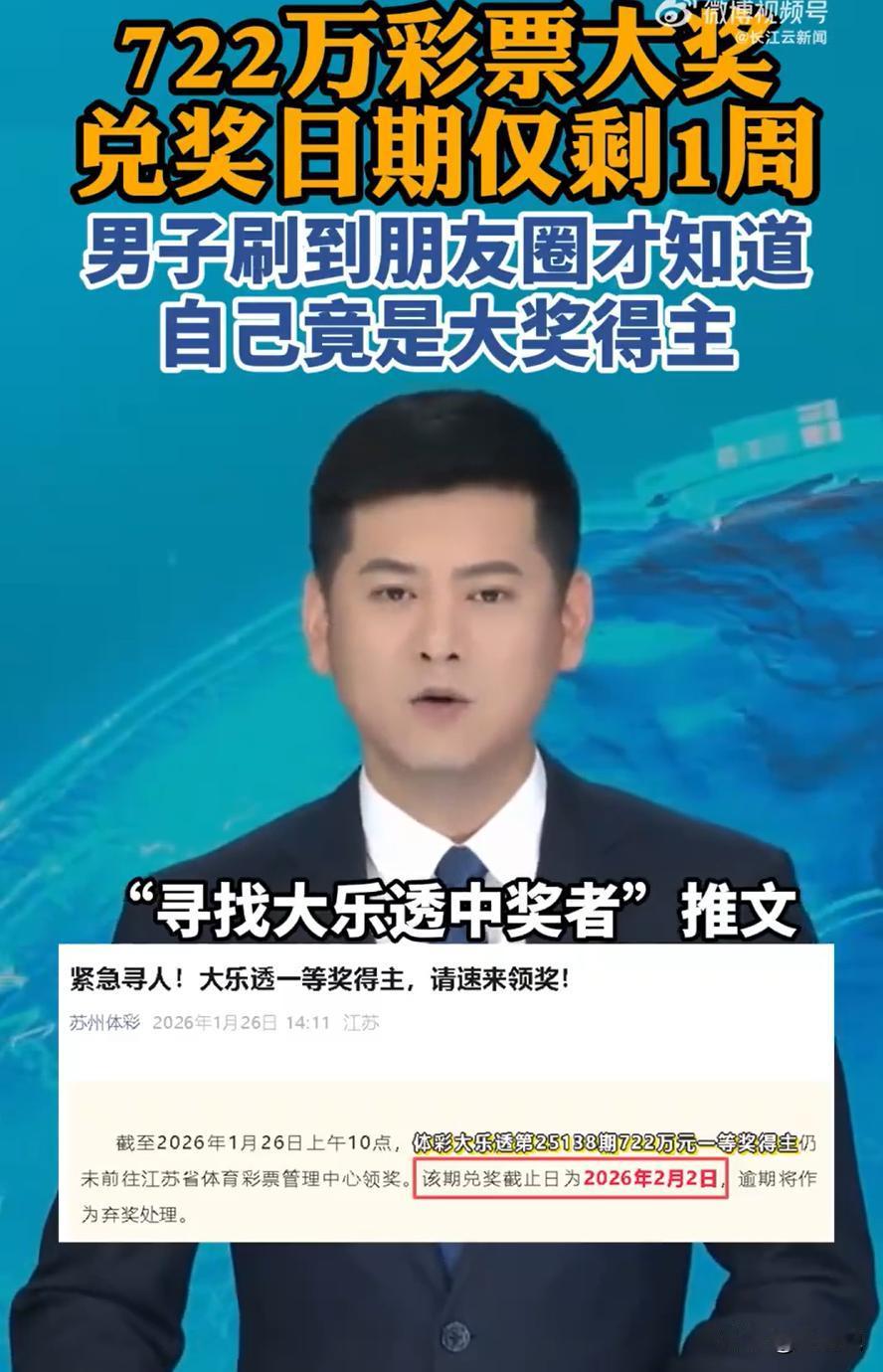 这就是命啊!江苏张家港,一男子晚上睡觉前看朋友圈,突然发现一位朋友转发了一条体彩文章,说是有人中了722万大奖却迟迟没有现身,男子还想着是谁心那么大,结果突然想起来自己之前好像也买过一张彩票,结果一兑奖,发现中大奖的不是别人,竟然就是自己 刘先生平时有买彩票的习惯,去年12月初,他顺手买了一张大乐透,之后也没特别在意,彩票往外套口袋里一塞,渐渐就忘在了脑后。直到今年1月26日晚上,他临睡前翻看朋友圈,看到有朋友转了一条信息,说当地有个七百多万的大奖一直没人领,提醒中奖者尽快去兑奖,还有一周就到期了 刘先生念头一闪,突然想起自己好像之前也买过一张彩票,一直没核对。他翻身起来,找到那件外套,从口袋里摸出了那张几乎被遗忘的彩票 他对着开奖期号和中奖号码,一个数字一个数字地对。一开始完全没往自己身上想,纯粹是好奇看看。没想到对完所有号码,发现全都对上了 刘先生一下子愣住了,甚至有点不敢信,又叫来爱人一起,反复核对了许多遍,才终于确认——那个被大家议论的“粗心”大奖得主,就是他自己 领奖手续办完后,刘先生自己也觉得像做梦。一张随手买的彩票,随手一放,差点就被永远忘在口袋角落 说起来,很多人买过彩票,都有类似经历,买的时候是随手一张,中奖这件事在心里本就排在很后面。真中了,反而不像电视剧里那样情绪爆炸,而是先懵住,先怀疑,再小心翼翼确认,只不过刘先生这次中的有点太大了 而这个事也是一个提醒,彩票不是即买即完的东西。大奖都有认领期限,时间一过,不管金额多大,都会按规则处理。每年都会出现中奖者差点错过的情况,并不是大家不想要 所以说,彩票不能当计划,但该有的基本动作别省。买了就留好,定期核对一下,花不了几分钟。真中了是运气,没中也当花钱买个念想。最怕的不是没中,是中了却不知道