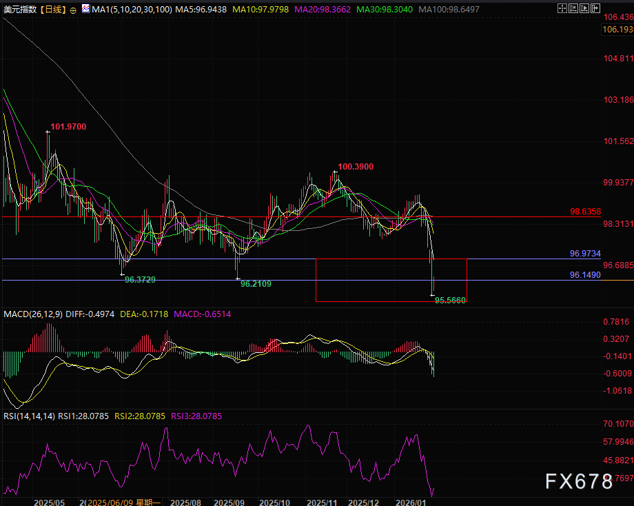 技术面美元指数跌破96.97关键价位,目前在96.15压力位附近震荡,目前支撑在95.32附近,以及96.15,压力位在96.97附近。