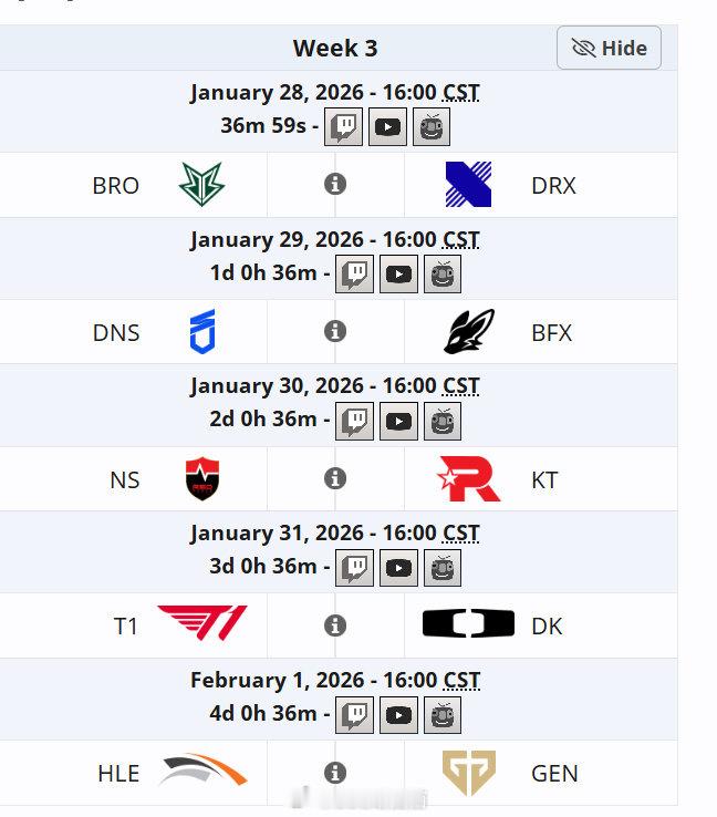 LCK超级周LCK的超级周将在今天开始,所有比赛都是BO5超级周赢了会获得双倍积分:1月28日:BRO vs DRX1月29日:DNS vs BFX1月30日:NS vs KT1月31日:T1 vs DK2月1日:HLE vs GENLCK杯英雄联盟S16
