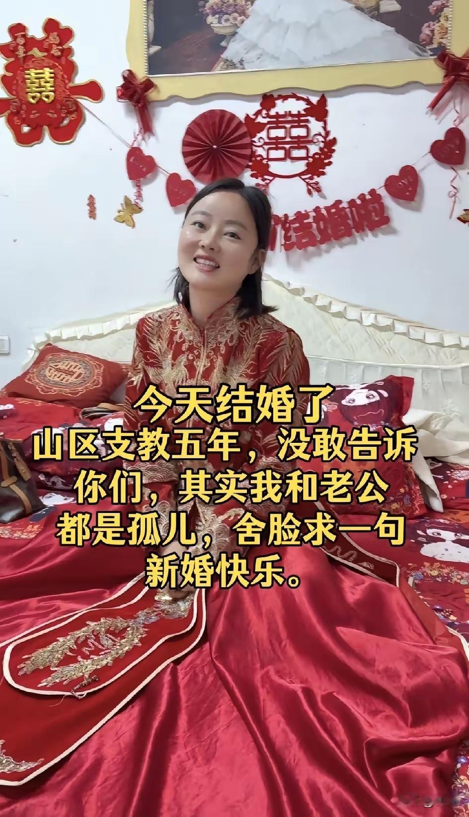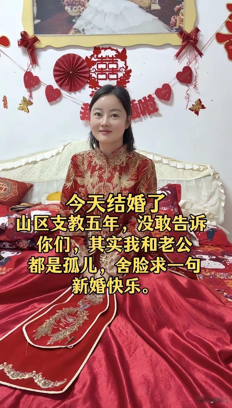 我结婚了,在山区支教5年,没敢告诉大家,其实我和老公都是孤儿,舍脸响大家求一句:新婚快乐!这是一位在山区支教五年的女士在网络上发出的声音。你把青春奉献给了山区,山区人民永远不会忘记你的,看你笑的这么甜,脑中出现你老公的幸福模样和学生们快乐的笑容。 祝新婚快乐,早生贵子,好好的爱,好好的教,尽快开枝散叶,顺带桃李满天下。 有网友表示:我觉得自己的祝福在你们面前没有意义,我反而想向你们请求祝福,因为你们为了孩子扎根山区,在我眼里你们是高尚的人,是脱离了低级趣味的人!所以,你们的祝福在我心里极为难得和珍贵,有着光辉! 祝福!从你灿烂的笑容中,可以感受到你找到了属于你的幸福。再次证明,两情相悦才是真正的爱情。 总有人在网上说,年轻支教老师都是作秀,熬不过三个月就会走。可我们在这大山里,守了一届又一届学生,看着原本辍学在家的女孩重返课堂,看着沉默寡言的男孩变得开朗自信,这些实实在在的改变,就是我们坚持的全部意义。 支教这条路不好走,未来或许还有更多难处,希望你们会一直陪着彼此,陪着山里的孩子,看着他们走出大山,看着他们拥有光明的未来。 对此大家怎么看呢