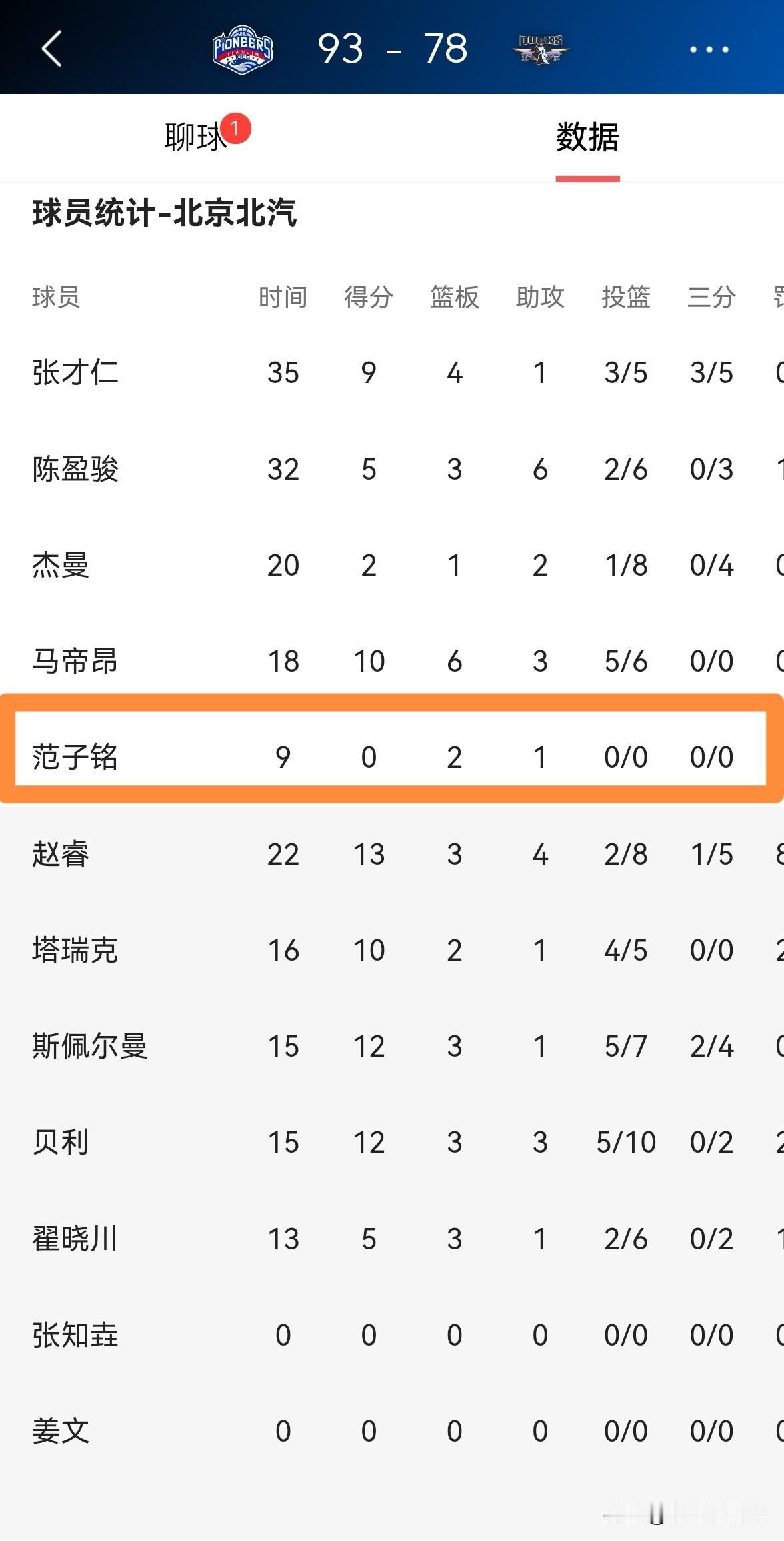 我强烈建议北京北汽主帅许利民弃用范子铭!在今天北京北汽客场以78:93不敌天津先行者的比赛中,范子铭的表现真是让人失望透顶,他在首发出战的9分钟里,没有出手,其中罚球2中0怒砍0分,吃到了3次犯规,他的场上正负值为全队最低的-19。 虽然范子铭的低迷不是北京北汽输球的主要原因,但是像这种连罚球都无法命中的球员还应该继续获得上场机会吗?我强烈建议许利民教练将范子铭的上场时间分给其他球员!