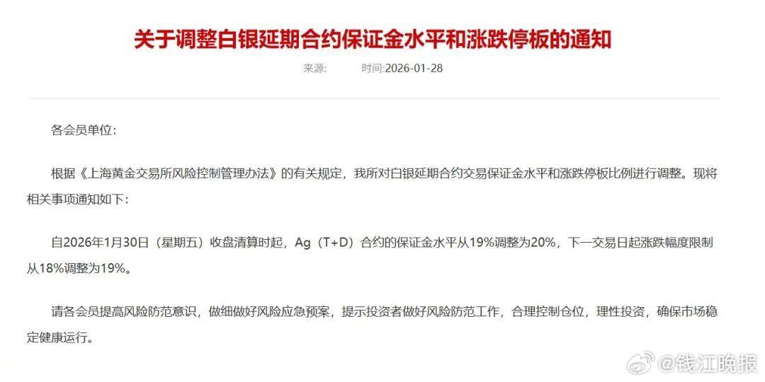 【#上期所上金所双双发布通知#】上期所、上金所双双发布通知,对多品种期货相关合约涨跌停板幅度和交易保证金比例进行调整。1月28日,上海黄金交易所(简称“上金所”)发布通知,根据《上海黄金交易所风险控制管理办法》的有关规定,我所对白银延期合约交易保证金水平和涨跌停板比例进行调整。现将相关事项通知如下:自2026年1月30日(星期五)收盘清算时起,Ag(T+D)合约的保证金水平从19%调整为20%,下一交易日起涨跌幅度限制从18%调整为19%。上海黄金交易所表示,请各会员提高风险防范意识,做细做好风险应急预案,提示投资者做好风险防范工作,合理控制仓位,理性投资,确保市场稳定健康运行。同日,上海期货交易所也发布通知称,自2026年1月30日(星期五)收盘结算时起,涨跌停板幅度和交易保证金比例调整如下:镍期货已上市合约的涨跌停板幅度调整为11%,套保持仓交易保证金比例调整为12%,一般持仓交易保证金比例调整为13%。氧化铝、铅、锌期货已上市合约的涨跌停板幅度调整为9%,套保持仓交易保证金比例调整为10%,一般持仓交易保证金比例调整为11%。不锈钢、铸造铝合金、螺纹钢、热轧卷板期货已上市合约的涨跌停板幅度调整为7%,套保持仓交易保证金比例调整为8%,一般持仓交易保证金比例调整为9%。黄金期货AU2606、AU2608、AU2610、AU2612、AU2702合约涨跌停板幅度调整为16%,套保持仓交易保证金比例调整为17%,一般持仓交易保证金比例调整为18%。白银期货AG2605、AG2606、AG2607、AG2608、AG2609、AG2610、AG2611、AG2612、AG2701合约涨跌停板幅度调整为16%,套保持仓交易保证金比例调整为17%,一般持仓交易保证金比例调整为18%。此外,1月28日,上海期货交易所还发布通知称,12组实际控制关系账户在相关合约上账户组日内开仓交易量超限达到交易所处理标准。上述客户交易行为违反《上海期货交易所异常交易行为管理办法》第16条之规定,交易所决定对相关客户在相应合约上采取限制开仓的监管措施。 #胖东来金条只剩十来块了# 来源:澎湃新闻