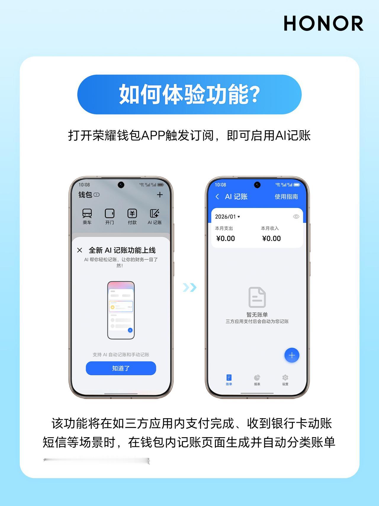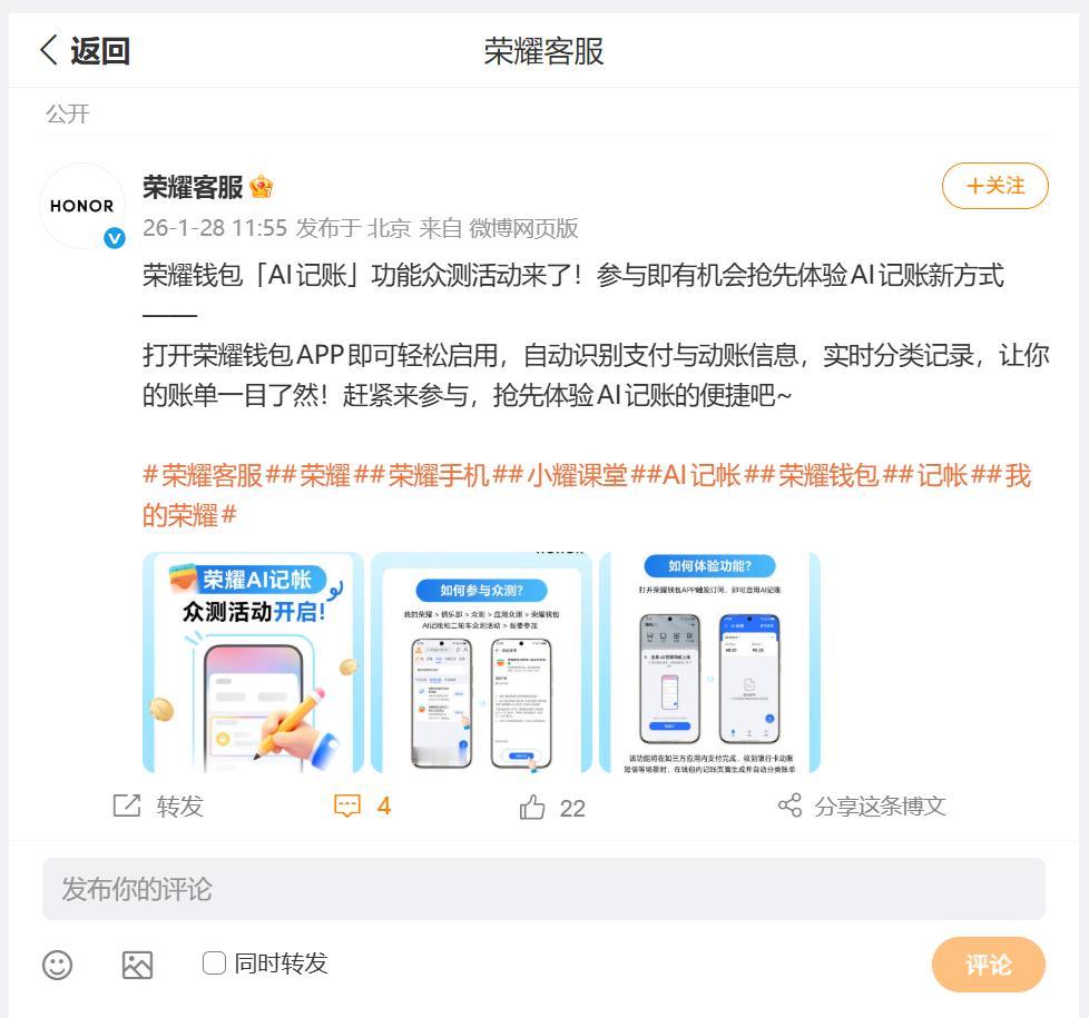 小伙伴们有没有发现,钱包这个物品距离自己越来越远了,纸质现金很少会从银行取出,大家都是扫码支付,或者进行转账、刷卡消费,这就造成对于现金流缺乏重视,月底会出现余额不足的情况,如何养成自己正确消费习惯呢?不妨试试MagicOS 10荣耀钱包AI记账。 荣耀钱包全新AI记账已经上线,启用之后,能够自动识别小伙伴支付,和动账的推送信息,能够实现实时的分类记录,多渠道支付页能够实现账单一目了然,正好荣耀AI记账众测活动也开启了,大家遇到使用中存在的问题,也能够第一时间将问题提交到开发工程师面前。 在信息化、数字化消费时代中,养成正确理财、合理消费的习惯蛮重要,荣耀钱包AI记账也是好帮手。现在只需关注 @超逸谈科技 并转发此微头条,2026年01月30日,将由 选出1位粉丝包邮送出暖暖杯55度礼品装,说不定下一个中奖的就是你哟!抽奖详情