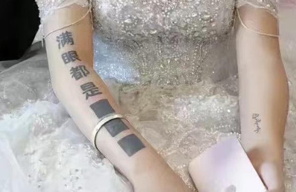 刷到这张照片,盯着看了很久。 "满眼都是■ ■"——4个字,盖住了2个。 突然想到一个冷知识:纹身遮盖比新纹疼3倍,要扎得更深才能压住旧色。 她忍着疼,把某些东西压在黑块下面。 然后穿着白纱,笑着走向另一个人。 这不是隐瞒,是刮骨疗毒的诚意。 你身边有人做过类似的选择吗? 【投票】遮盖过去,是尊重还是遗憾? 纹身 婚礼