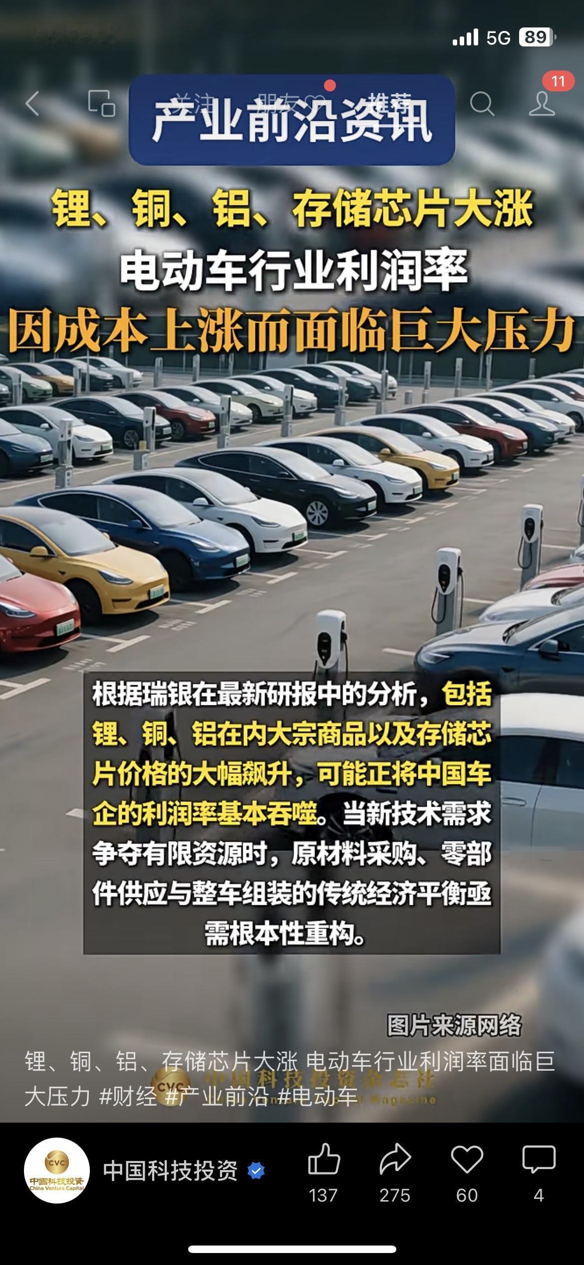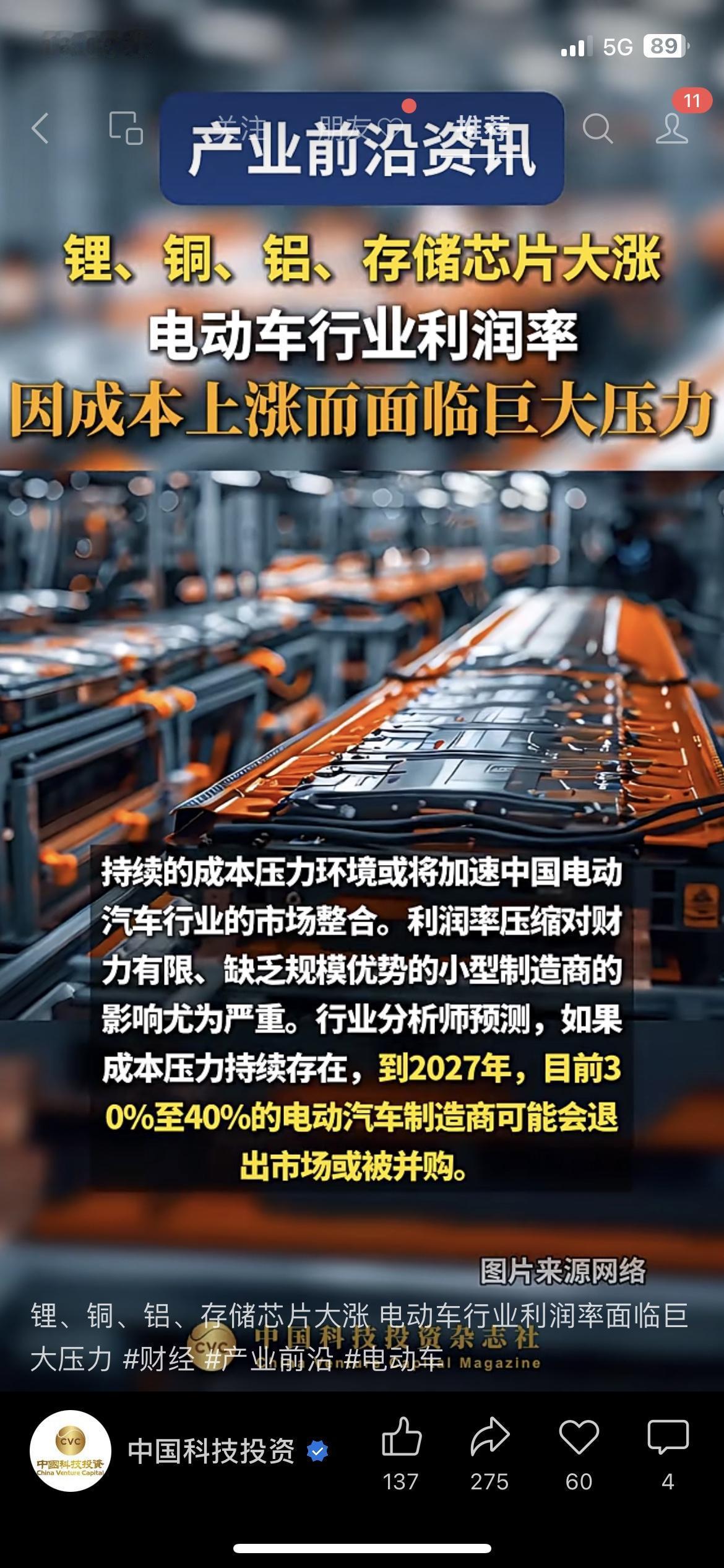 警惕!锂铜铝芯片集体大涨,电动车厂利润被啃光!瑞银研报直言,2027年30%-40%中小车企或直接出局,原材料占电动车成本6成,涨价让每辆车成本涨3-5万。身边提车的朋友都慌了,怕小厂倒了没售后。 电动车买的不是车,是背后厂牌的抗风险能力。 市场有风险,投资需谨慎 你会现在买电动车,还是等行业洗牌后再入手? 电动车行业洗牌 新能源财经 财经热点