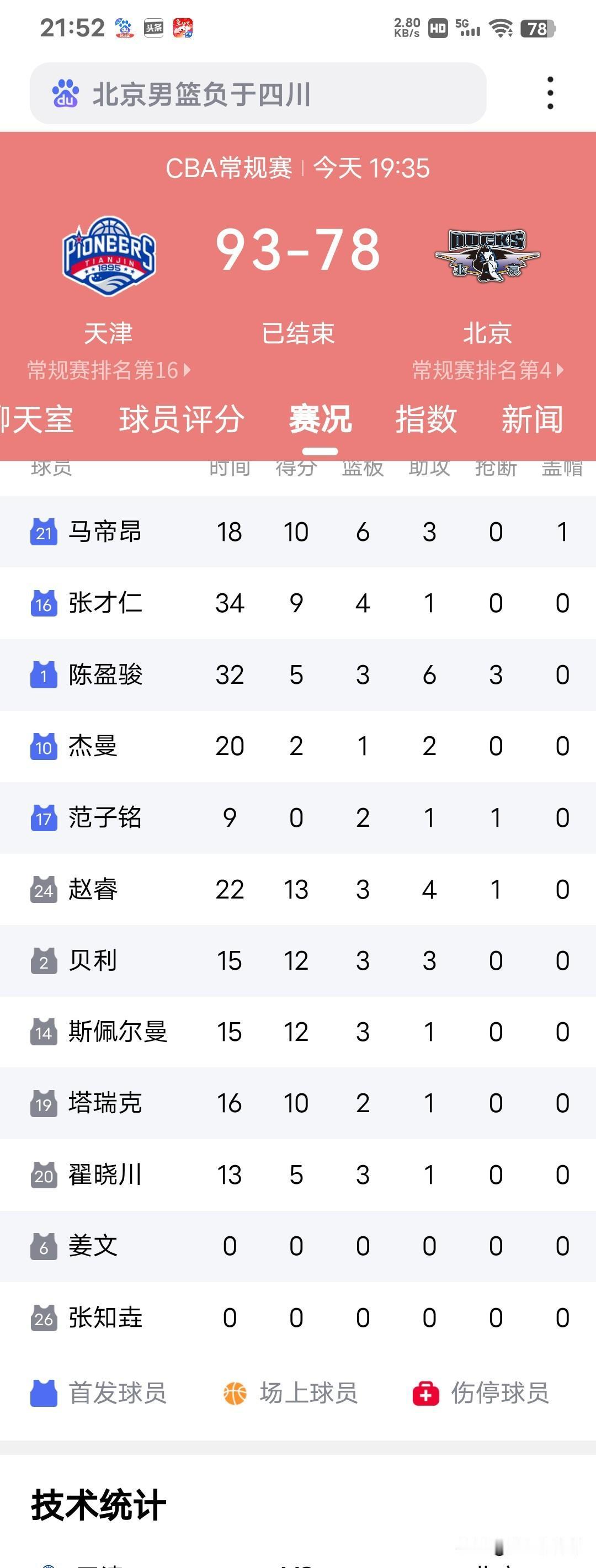 北京客场78:93爆冷不敌天津,这4人该为输球背锅: 1.杰曼--全场出战20分钟,全场仅8投1中,其中三分球4投0中,全场仅贡献2分1篮板2次助攻,显然上一场在山西主场被球迷吐口水仍影响到心情。 2.陈盈骏--全场出战32分钟,全场仅6投2中,其中三分球3投0中,全场仅贡献5分3篮板6次助攻3比抢断,手感显然被杰曼心情传染了。 3.范子铭--首发,全场仅出战9分钟,一分未的,仅2篮板1次助攻,全场打得像梦游一样。 4.张才仁--首发出战34分钟,仅贡献9分4篮板,手感那么火热,有机会就是出手太犹豫。