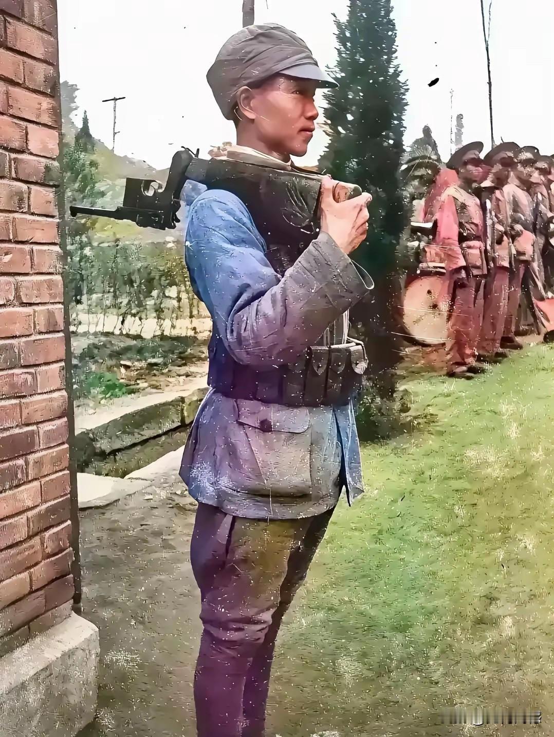 画面中的这个小战士,身材特别的挺拔,站姿势特别的端正,看起来非常的精神,非常的帅气,体现了良好的军人气质,要知道,这可是七八十年前的军人,说明那时候对军容的要求也是非常严格的。这张照片最吸引眼球的,还是战士肩上扛的这支枪,这支枪的造型比较奇特,以前没有看过!
