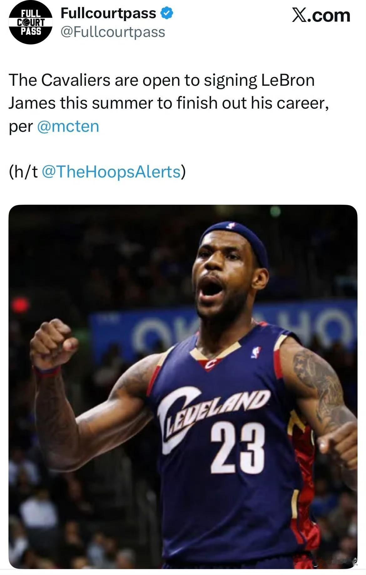 热烈欢迎回来!骑士队表明了态度! 据美知名体育媒体Fullcourtpass报道:克利夫兰骑士队愿意在今年夏天签下詹姆斯,让他在此结束职业生涯。随后Espn湖人队跟队记者Dave McMenaminen跟进报道:多位消息人士透露,如果詹姆斯愿意在休赛期重回骑士队,后者会无比欢迎他的回归。 詹姆斯与湖人队的合同将于今年夏天到期,他将成为完全自由球员,可以加盟任何球队。目前没有詹姆斯与湖人队准备续约洽谈的消息,也不知道詹姆斯未来的计划,这将成为大众关注的焦点。目前,骑士队率先表明了自己的态度,他们热烈欢迎队史第一人在休赛期回归球队,开启他职业生涯的第24个赛季。如此一来,压力给到湖人队了,对于下赛季42岁的詹姆斯到底要不要续约?骑士队可准备抢这棵“摇钱树”了!