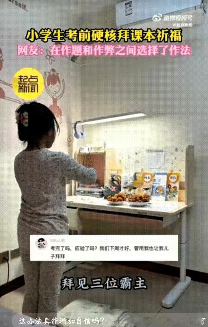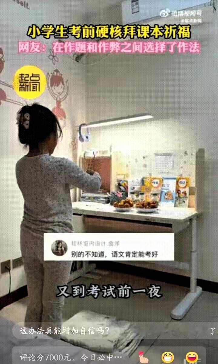 “太逗了!”陕西西安,一名小女孩在期末考试前一天“临时抱佛脚”,把语数英三科课本整齐立在桌上,摆上两盘橘子当贡品,拿三支笔代替香烛,一本正经地鞠躬念叨,这可爱的一幕被妈妈悄悄拍了下来,简单的小举动满是童真。 视频发到网上后,评论区瞬间被回忆杀填满,大家纷纷分享自己小时候的同款经历:有人把课本压在枕头下睡觉,希望知识能悄悄记进脑子里;有人对着笔默默祈祷,盼着它能变成“神笔”,考试写啥都对;还有人考前会特意吃油条加鸡蛋,就为了讨个好彩头,原来不同年代的孩子,面对考试都有这样单纯的小心思。 其实孩子未必不知道这样的做法没用,却偏偏用这种可爱的方式,缓解着面对期末考试的小焦虑。这不是幼稚的迷信,而是小朋友独有的解压方式,一份简单的仪式感,能让她心里多一份安稳,面对考试也能多一点底气,这份认真对待考试的心意,特别可贵。 孩子的世界本就简单纯粹,一点点小美好就能抚平不安,比起纠结仪式感有没有用,更难得的是她面对考试的重视,还有这份自带的情绪调节能力。这样的童真瞬间,不仅暖了家人,也让网友想起了自己的童年,简单又美好。