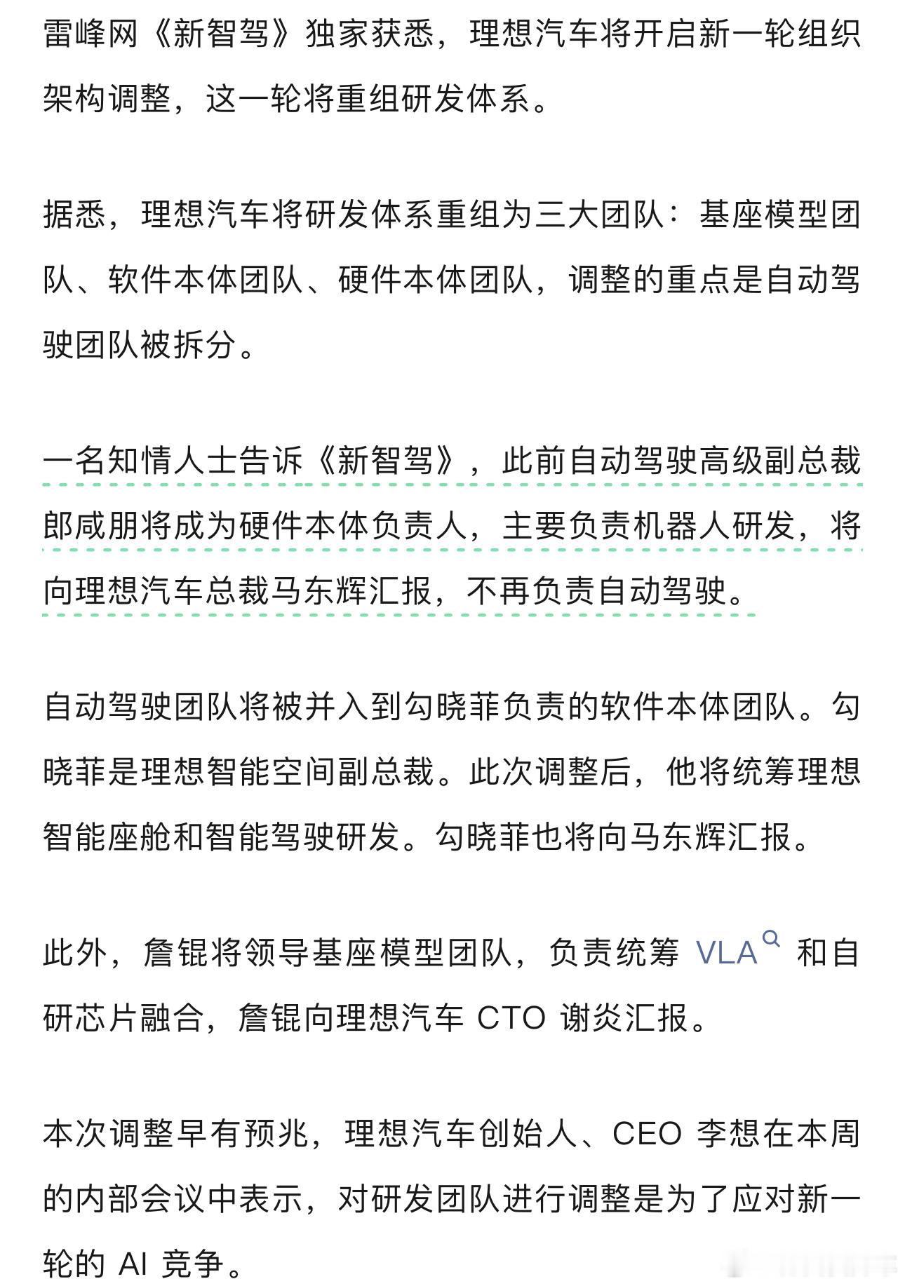 理想的战略升维,意味着组织变革,一切才刚刚开始。关于近期理想组织人事调整的信息:1. 理想启动新一轮研发体系重组,2. 理想研发架构重组为三大团队,3. 分别为基座、软件、硬件本体,4. 本轮调整重点在自动驾驶团队,5. 自动驾驶团队被拆分并重组,6. 郎咸朋转任硬件本体负责人,7. 郎咸朋聚焦机器人研发方向,8. 郎咸朋将不再负责自动驾驶,9. 硬件本体团队向马东辉汇报,10. 自动驾驶并入软件本体团队,11. 软件本体由勾晓菲统一负责,12. 勾晓菲统筹智舱与智驾研发,13. 勾晓菲也同样向马东辉汇报,14. 詹锟负责理想基座模型团队,15. 并统筹 VLA 与自研芯片融合,16. 詹锟将向理想 CTO 谢炎汇报。理想汽车新能源汽车人形机器人