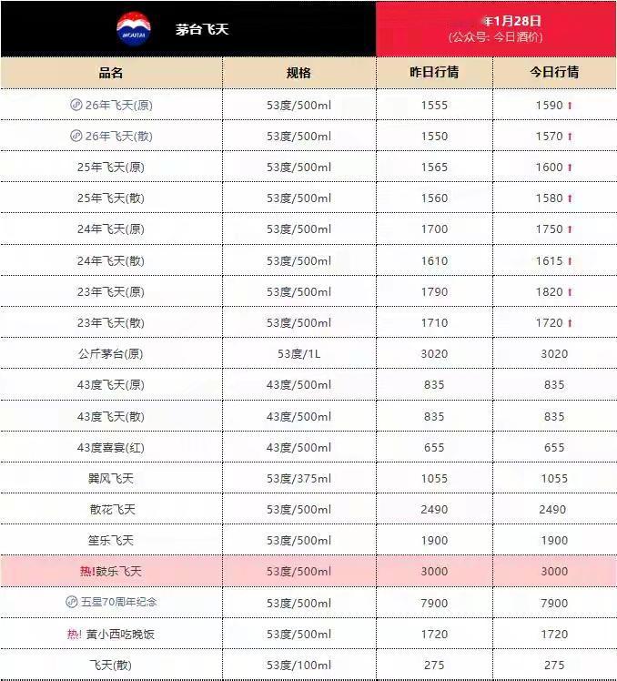 救救房地产可以理解,飞天茅台就不要跟风了。1月28日,酒业数据平台“今日酒价”显示,1月28日,茅台酒全线上涨。 涨得如此有“规律”:原箱还是比散瓶涨幅多一点。 这个“规律”加上贵州茅台股价近段时间以来,总是单边一路下跌,似乎又有点互相矛盾。 一直以来,资本市场的嗅觉都比实体经济的嗅觉相对快半拍。一般情况下,当该行业的股价开始上升时,也就意味着该行业的拐点即将到来。寒流过后,春天也就不远了。正所谓:春江水暖鸭先知。 出现这种情况,似乎是有资本在逆市自救。万一飞天茅台的零集价,低于1499元/瓶。那茅台的“神话”也将结束,茅台“硬通货”的属性也将失去。贵州茅台的股价在A股的地位也将很快被一大批科技股股价远远的甩在后面。 关键的问题是,飞天茅台的价格低在那里?实属难以推测。999元,还是888元?
