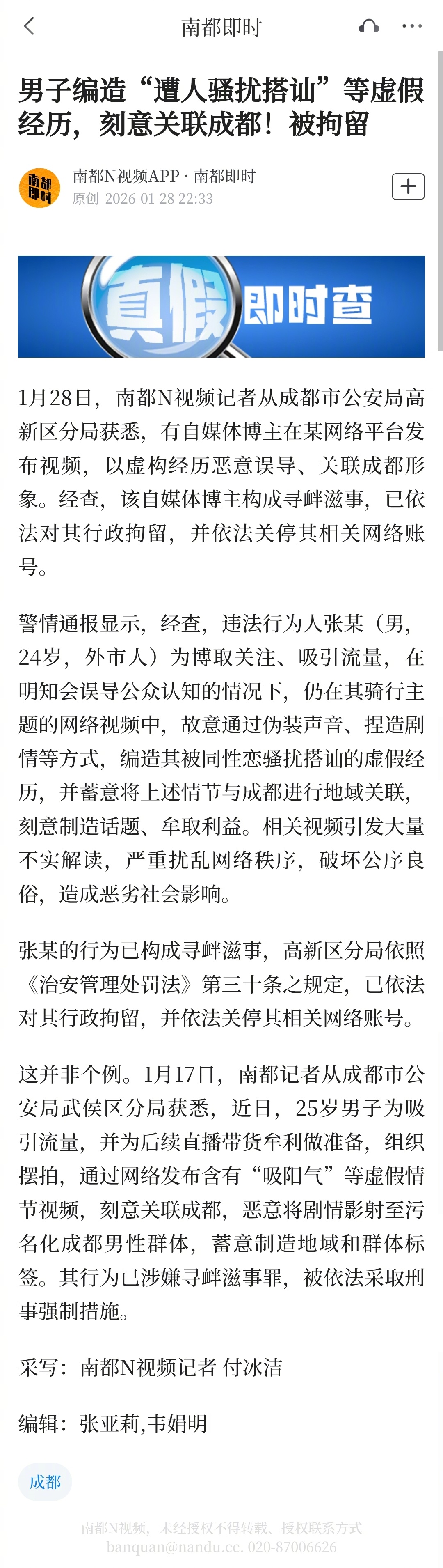 #男子编造被骚扰经历刻意抹黑成都#【男子编造“遭人骚扰搭讪”等虚假经历,刻意关联成都!被拘留】#男子编造虚假经历抹黑成都被拘#1月28日,南都N视频记者从成都市公安局高新区分局获悉,有自媒体博主在某网络平台发布视频,以虚构经历恶意误导、关联成都形象。经查,该自媒体博主构成寻衅滋事,已依法对其行政拘留,并依法关停其相关网络账号。警情通报显示,经查,违法行为人张某(男,24岁,外市人)为博取关注、吸引流量,在明知会误导公众认知的情况下,仍在其骑行主题的网络视频中,故意通过伪装声音、捏造剧情等方式,编造其被同性恋骚扰搭讪的虚假经历,并蓄意将上述情节与成都进行地域关联,刻意制造话题、牟取利益。相关视频引发大量不实解读,严重扰乱网络秩序,破坏公序良俗,造成恶劣社会影响。张某的行为已构成寻衅滋事,高新区分局依照《治安管理处罚法》第三十条之规定,已依法对其行政拘留,并依法关停其相关网络账号。