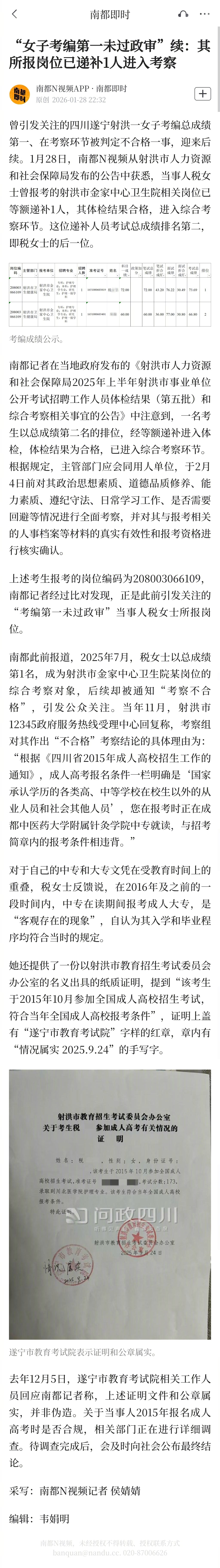 #女子考编第一未过政审最新进展#【“女子考编第一未过政审”续:其所报岗位已递补1人进入考察】#女子考编第1政审不合格后续#曾引发关注的四川遂宁射洪一女子考编总成绩第一、在考察环节被判定不合格一事,迎来后续。1月28日,南都N视频从射洪市人力资源和社会保障局发布的公告中获悉,当事人税女士曾报考的射洪市金家中心卫生院相关岗位已等额递补1人,其体检结果合格,进入综合考察环节。这位递补人员考试总成绩排名第二,即税女士的后一位。南都记者在当地政府发布的《射洪市人力资源和社会保障局2025年上半年射洪市事业单位公开考试招聘工作人员体检结果(第五批)和综合考察相关事宜的公告》中注意到,一名考生以总成绩第二名的排位,经等额递补进入体检,体检结果为合格,已进入综合考察环节。根据规定,主管部门应会同用人单位,于2月4日前对其政治思想素质、道德品质修养、能力素质、遵纪守法、日常学习工作、是否需要回避等情况进行全面考察,并对其与报考相关的人事档案等材料的真实有效性和报考资格进行核实确认。上述考生报考的岗位编码为208003066109,南都记者经过比对发现,正是此前引发关注的“考编第一未过政审”当事人税女士所报岗位。南都此前报道,2025年7月,税女士以总成绩第1名,成为射洪市金家中心卫生院某岗位的综合考察对象,后续却被通知“考察不合格”,引发公众关注。当年11月,射洪市12345政府服务热线受理中心回复称,考察组对其作出“不合格”考察结论的具体理由为:“根据《四川省2015年成人高校招生工作的通知》,成人高考报名条件一栏明确是‘国家承认学历的各类高、中等学校在校生以外的从业人员和社会其他人员’,您在报考时正在成都中医药大学附属针灸学院中专就读,与招考简章内的报考条件相违背。”对于自己的中专和大专文凭在受教育时间上的重叠,税女士反馈说,在2016年及之前的一段时间内,中专在读期间报考成人大专,是“客观存在的现象”,自认为其入学和毕业程序均符合当时的规定。
