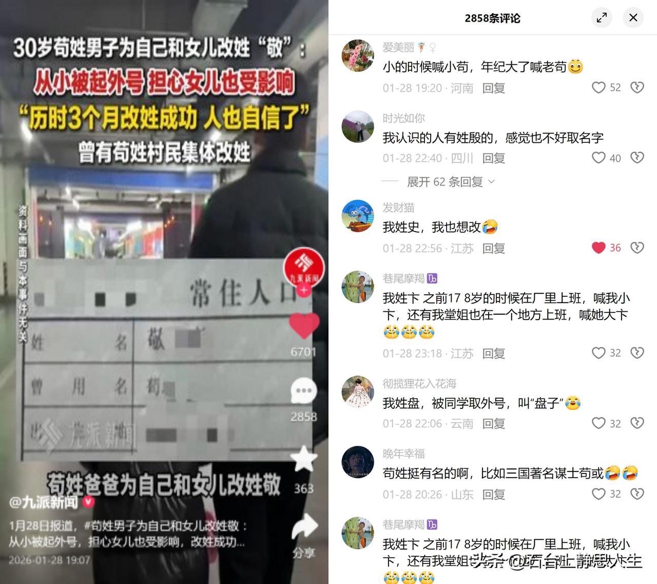 苟姓男子改回敬姓 30岁的他从小因方言谐音被起外号,怕女儿也受这份困扰,花3个月把自己和女儿的姓改成敬。这不算凭空改姓,纯粹是认祖归宗,历史上不少苟姓本是敬姓,为避后晋石敬瑭名讳,被迫拆敬为苟,从此代代相传。 大家讨论得挺热闹,姓史、卞、廖的朋友扎堆诉苦:上学被起外号,上班怕被调侃,连跟人打招呼都要提前在心里彩排。这种看似无关紧要的尴尬,往往是不少人藏在心里的小刺。没人想被贴上莫名其妙的标签,可有时候偏逃不开周围无意识的玩笑。 说到底,改姓真不算矫情,想活得更自在点罢了。比起姓氏里的历史枷锁,让自己和孩子抬头挺胸过日子,才是最实在的事。毕竟,名字本该被尊重,何必当成笑料。