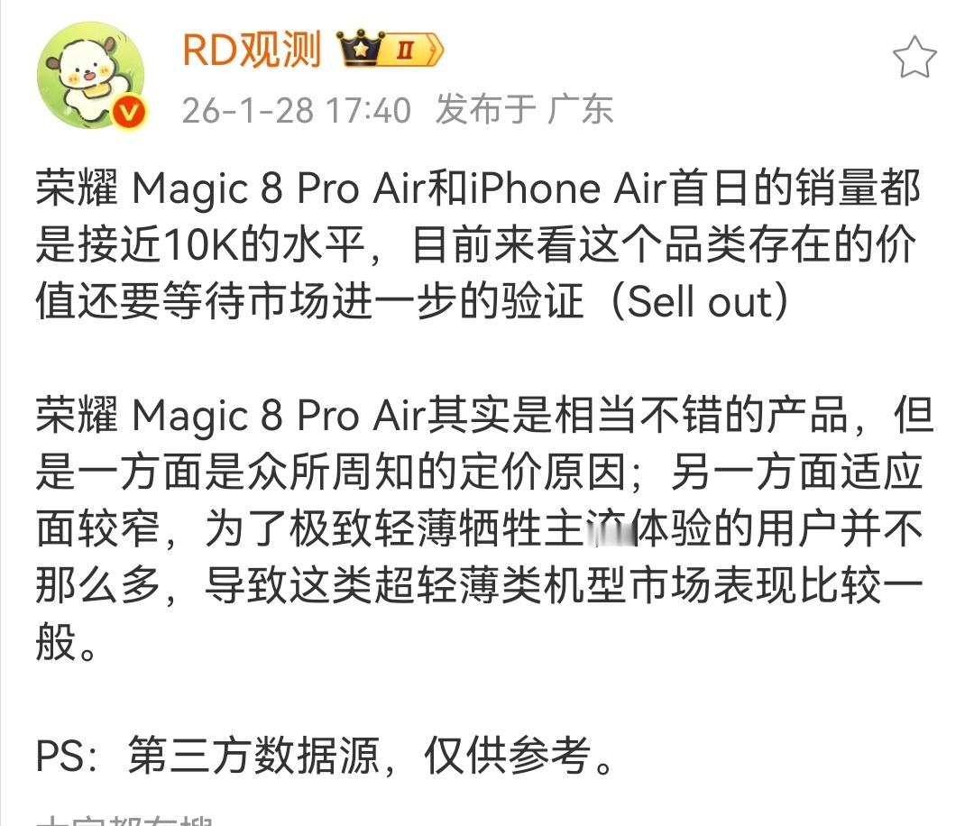 其实荣耀Magic8 Pro Air首销能做到和iPhone Air差不多的成绩,这对于荣耀来说就已经算很可以了。