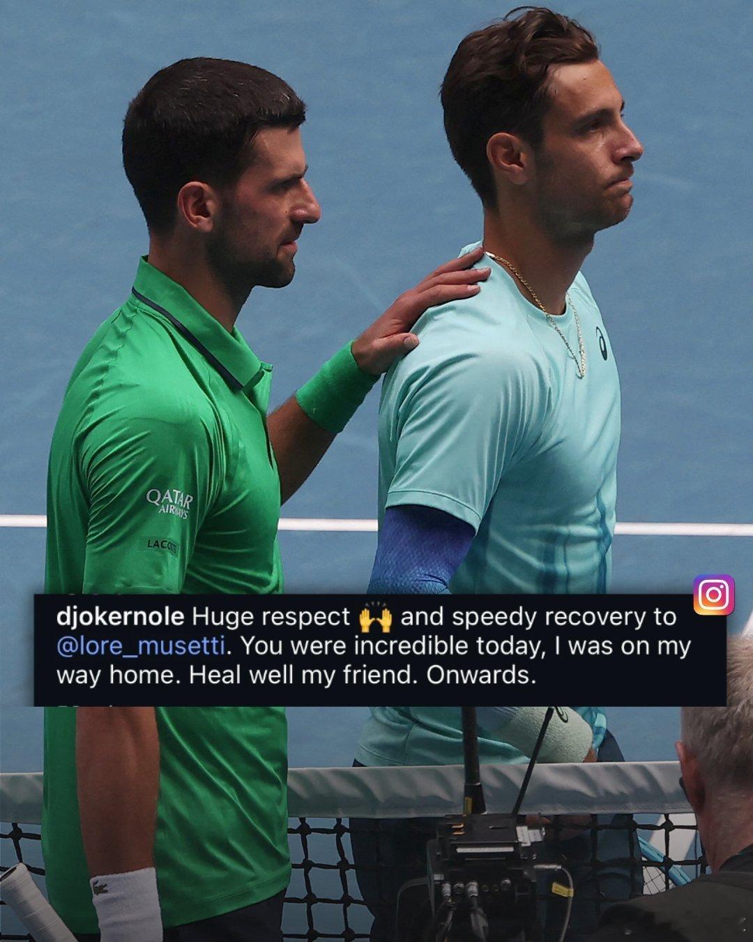 德约科维奇发文,预祝穆塞蒂早日康复。澳网2026穆塞蒂澳网因伤退赛 德约科维奇晋级澳网四强