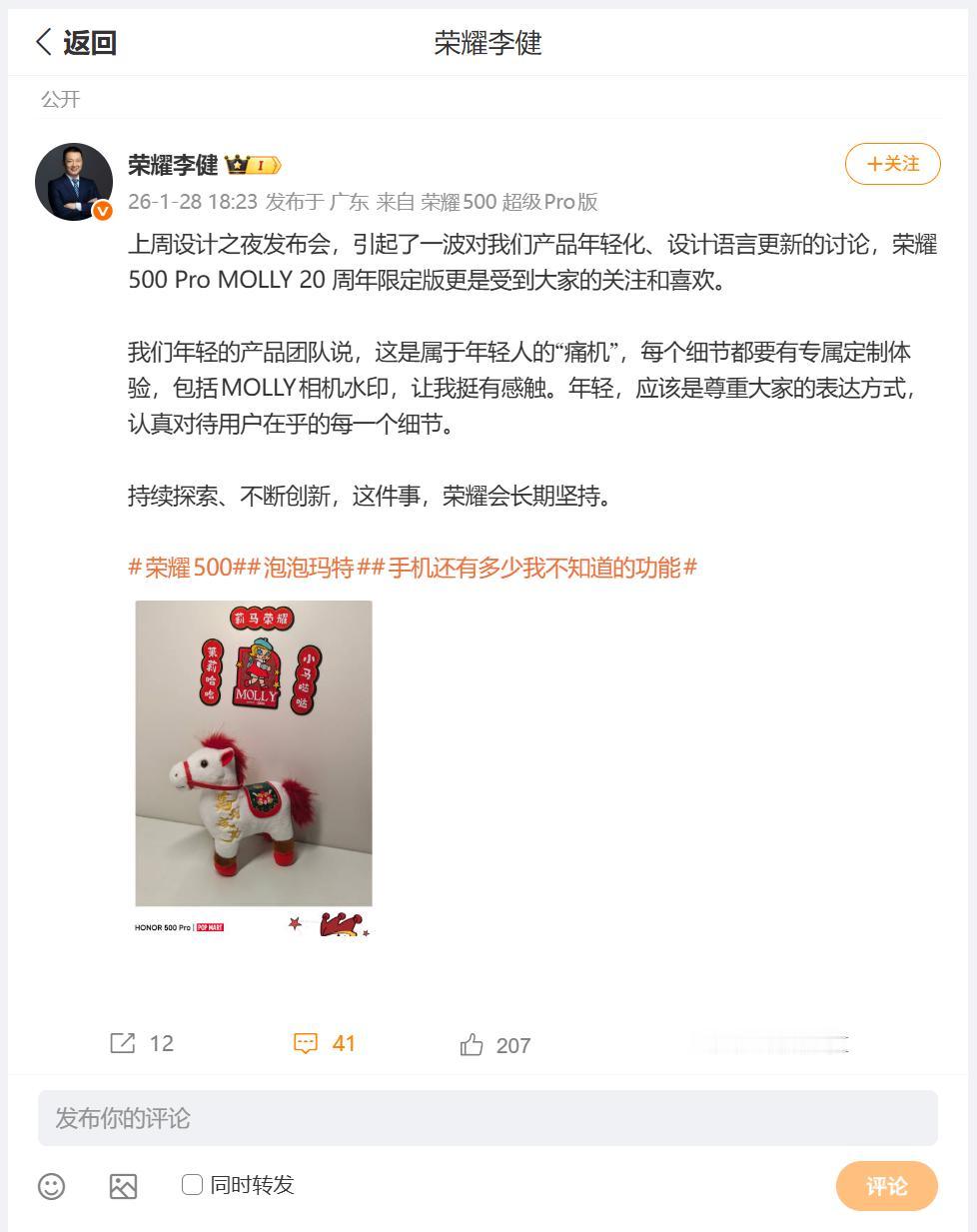 小伙伴们最近看到了手机品牌与热门IP的联名产品,例如:荣耀500 Pro MOLLY 20 周年限定版,我是蛮喜欢的,刚刚看到荣耀CEO李健发了一篇图文,当真没有想到,相机水印居然也有IP联名,MOLLY相机水印,当真让大伙特别惊讶,确实蛮有意思 畅聊数码新品 数码资讯