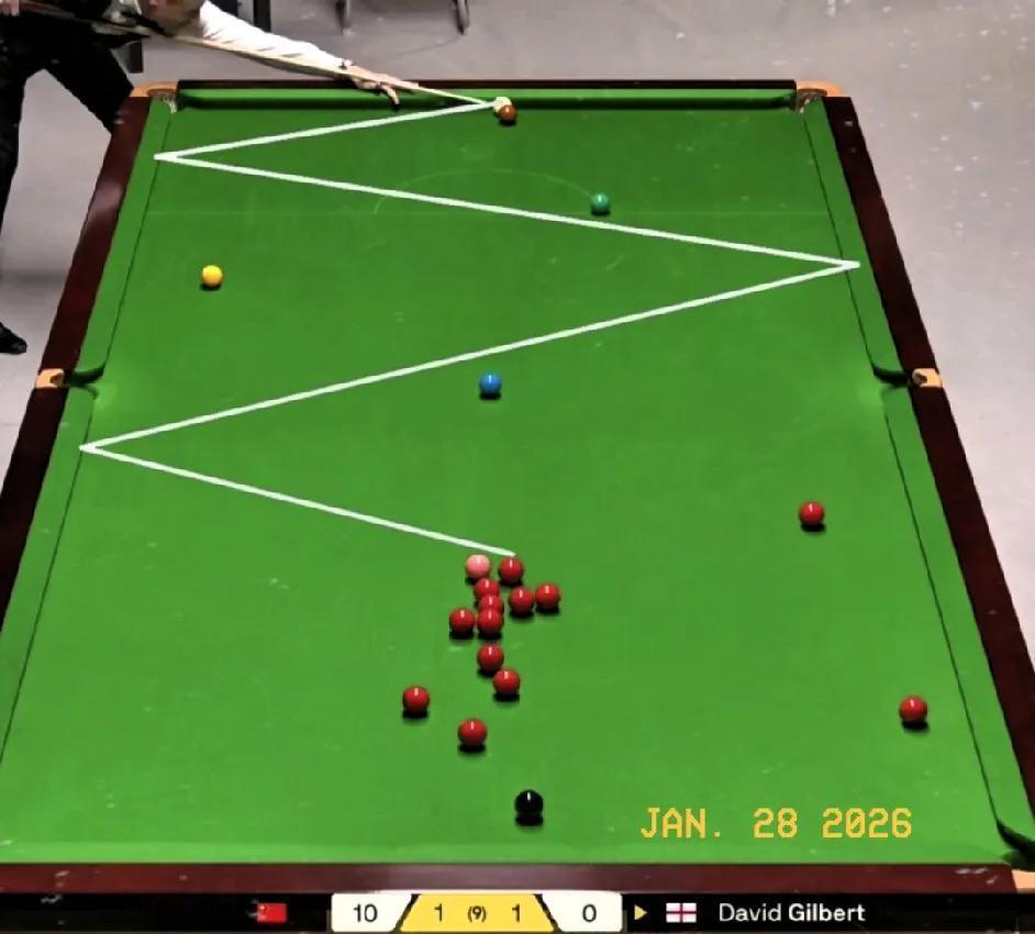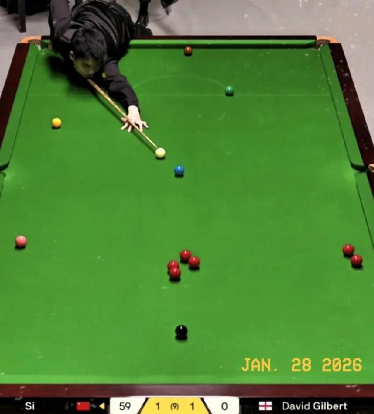 第3局,斯佳辉再下一城,比分2-1反超。 斯佳辉开局一杆安全球防守做成漂亮的斯诺克,让吉尔伯特罚3杆14分。 随后上手进攻打至59-0奠定胜局。