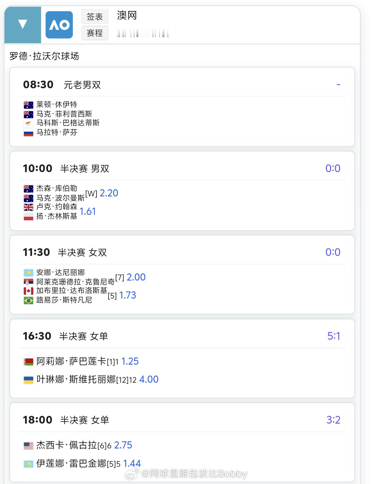 中国网球波比台bbtv 1月29日赛程:12:30🇨🇳张帅/🇧🇪梅尔滕斯澳网女双半决赛(玛格丽特考特球场)15:30🇨🇳朱琳vs维基奇🇭🇷(WTA125马尼拉站1/4决赛)16:30🇧🇾萨巴伦卡vs斯维托丽娜[12]🇺🇦(澳网女单半决赛-罗德拉沃尔球场)19:00🇰🇿莱巴金娜vs佩古拉🇺🇸(澳网女单半决赛-罗德拉沃尔球场)这很澳网澳网2026网球显眼包波比Bobby