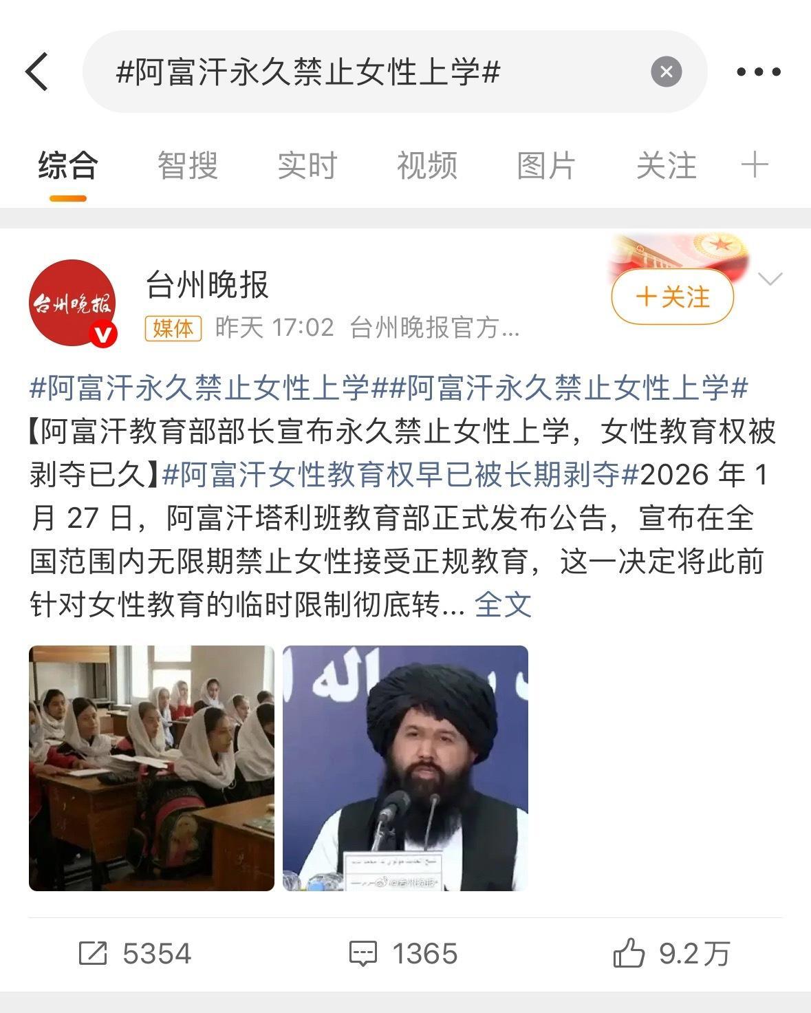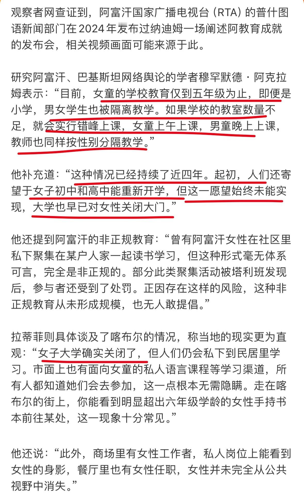 阿富汗女性教育到小学为止看了观网的报道,省流一下:①不是禁止上学,是上到小学为止。②旧闻,已经四年了。③男女分开上课,女子初中高中一直没有重新开学。至于这个阿富汗永久禁止女性上学 ,纯粹是假新闻。