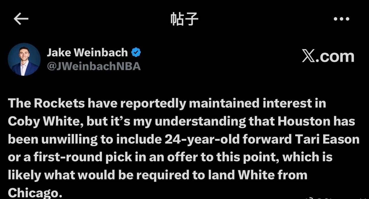 据报道,火箭队一直对科比·怀特保持着兴趣,但据我了解,到目前为止,休斯顿一直不愿意在报价中加入 24 岁的前锋塔里·伊森或首轮选秀权,而这很可能是得到芝加哥队科比·怀特所必需的。休斯顿火箭休斯顿火箭队