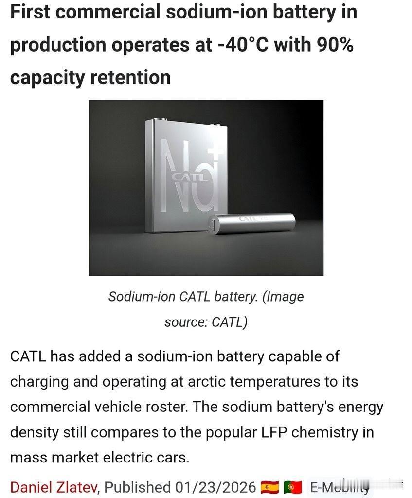 重大突破:宁德时代刚刚发布了可在-40°C下工作的极寒钠离子电动汽车电池。 “简而言之,他们推出了一款商用钠离子电池,用于电动汽车,即使在极低温度下也能正常工作。这种新型动力电池技术在-40°C时仍能保持约90%的容量,而传统的锂离子电池通常难以达到这种条件,并且该电池可在-30°C左右充电。这款45千瓦时的电池组使用储量丰富的钠而非更昂贵的锂材料,因此有望应用于寒冷气候下的商用电动汽车。” “钠离子电池通常使用更常见的材料,并且与传统的锂离子电池系统相比,具有更强的热稳定性和潜在的成本优势。据报道,该产品的能量密度约为175 Wh/kg,接近于流行的磷酸铁锂电池,并且该技术是未来几年计划更广泛商业部署的一部分。”
