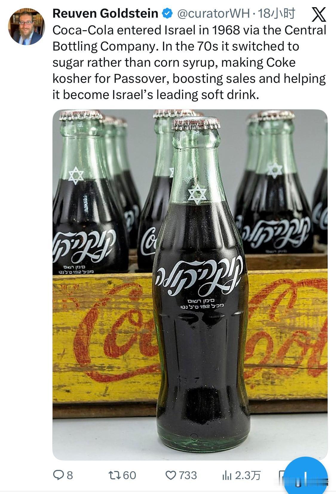 可口可乐于 1968 年通过中央装瓶公司进入以色列市场。在 70 年代,可口可乐改用糖而不是玉米糖浆,使可乐符合逾越节的犹太教规,从而促进了销量,并帮助其成为以色列领先的软饮料。 当时,为了确保逾越节(Passover)期间的销量,可口可乐通过使用甜菜糖或蔗糖来替代被视为“基特尼奥特”(Kitniyot,包含玉米、大豆等)的玉米糖浆,从而获得了逾越节期间的特殊犹太洁食认证(Kosher for Passover)。 这种对当地宗教习俗的深度适配,不仅解决了特定节日的饮用限制,更在品牌认同感上帮助其超越了竞争对手(如百事可乐)。根据 Coca-Cola Israel (CBC) 的官方历史回顾,这种本土化策略是其巩固市场领导地位的核心因素之一。